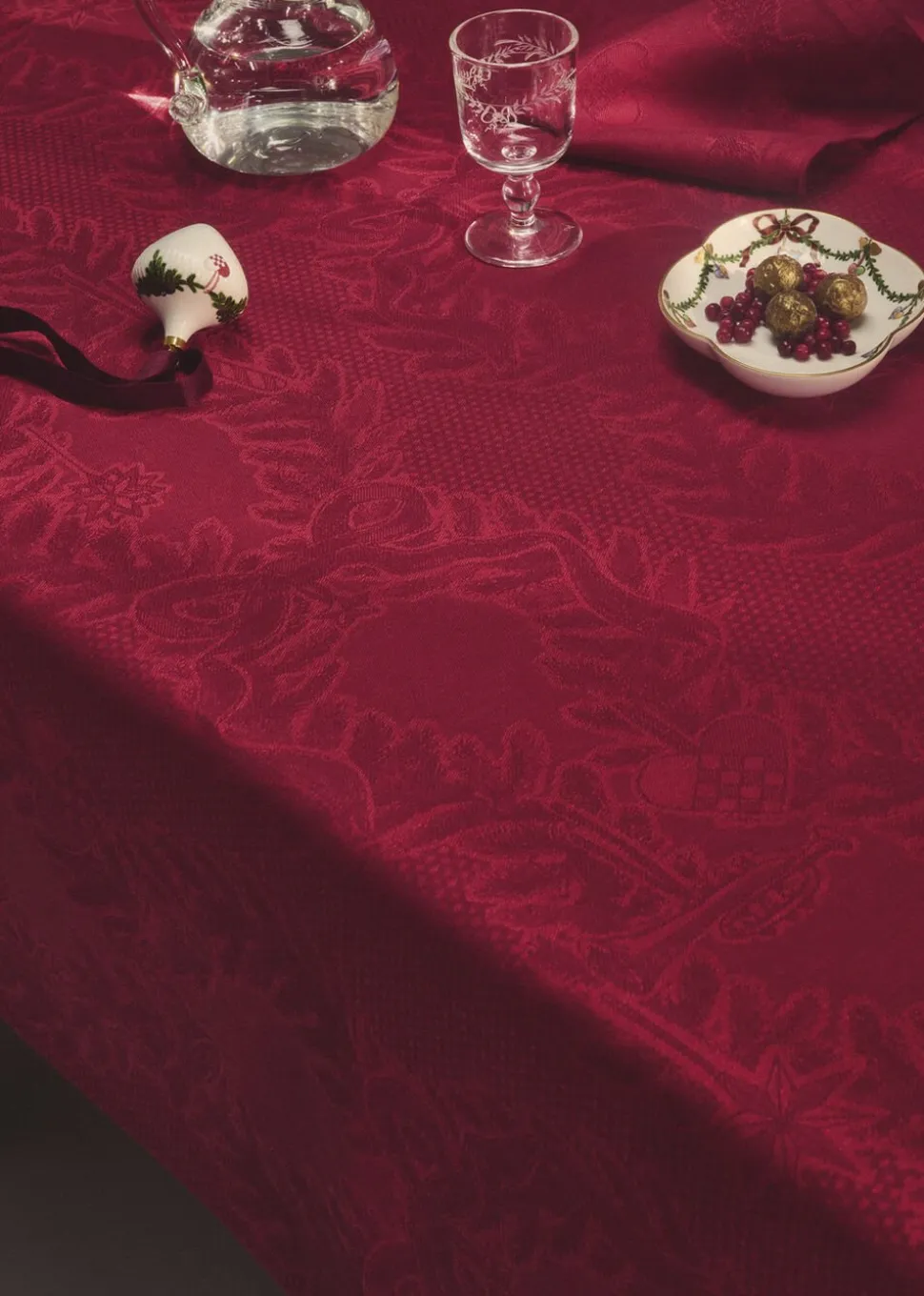 Tilføj ekstra magi til julebordet med den smukke dug i Stjerne Riflet Jul. Med inspiration fra det festlige stel er dugen dekoreret med stemningsfuld julepynt såsom stjerner, hjerter og bånd. Dugen er lavet i et hør- og bomuldsmix og er damaskvævet i en vidunderlig rød farve, der emmer af julehygge. Vælg mellem to størrelser.