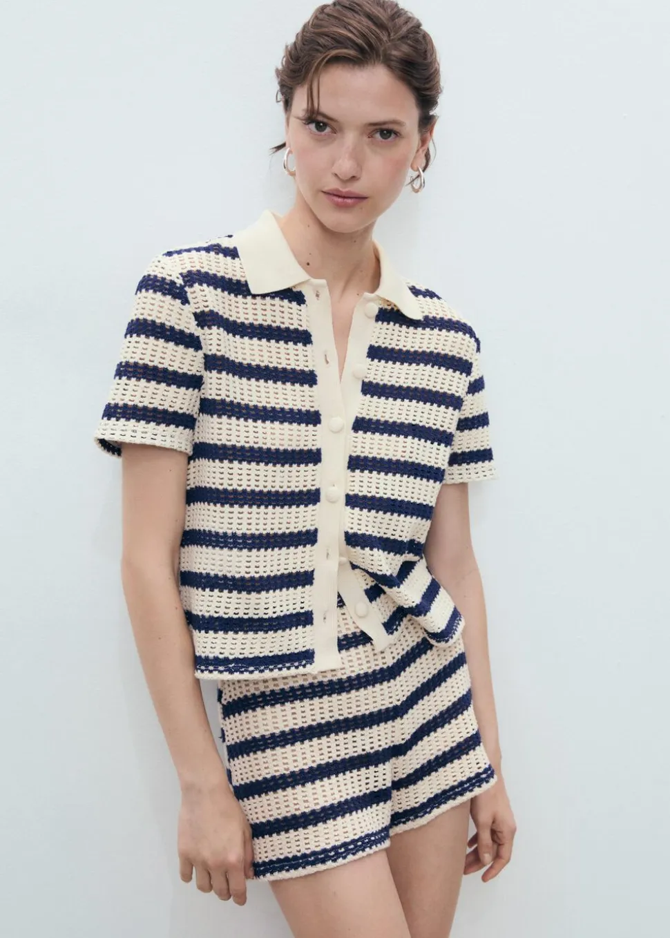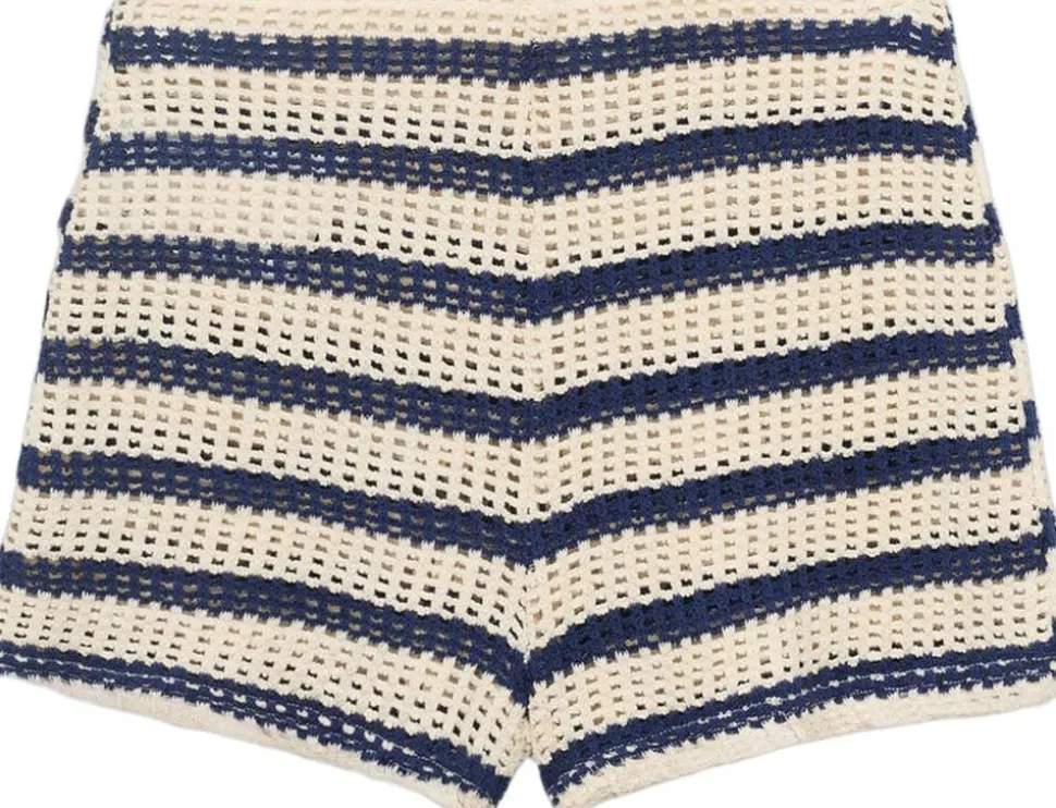 Skridtstof, mediumstrikket stof, kort Design, lige Design, stribet Design, elastisk linning, ingen lukning, totalt look.