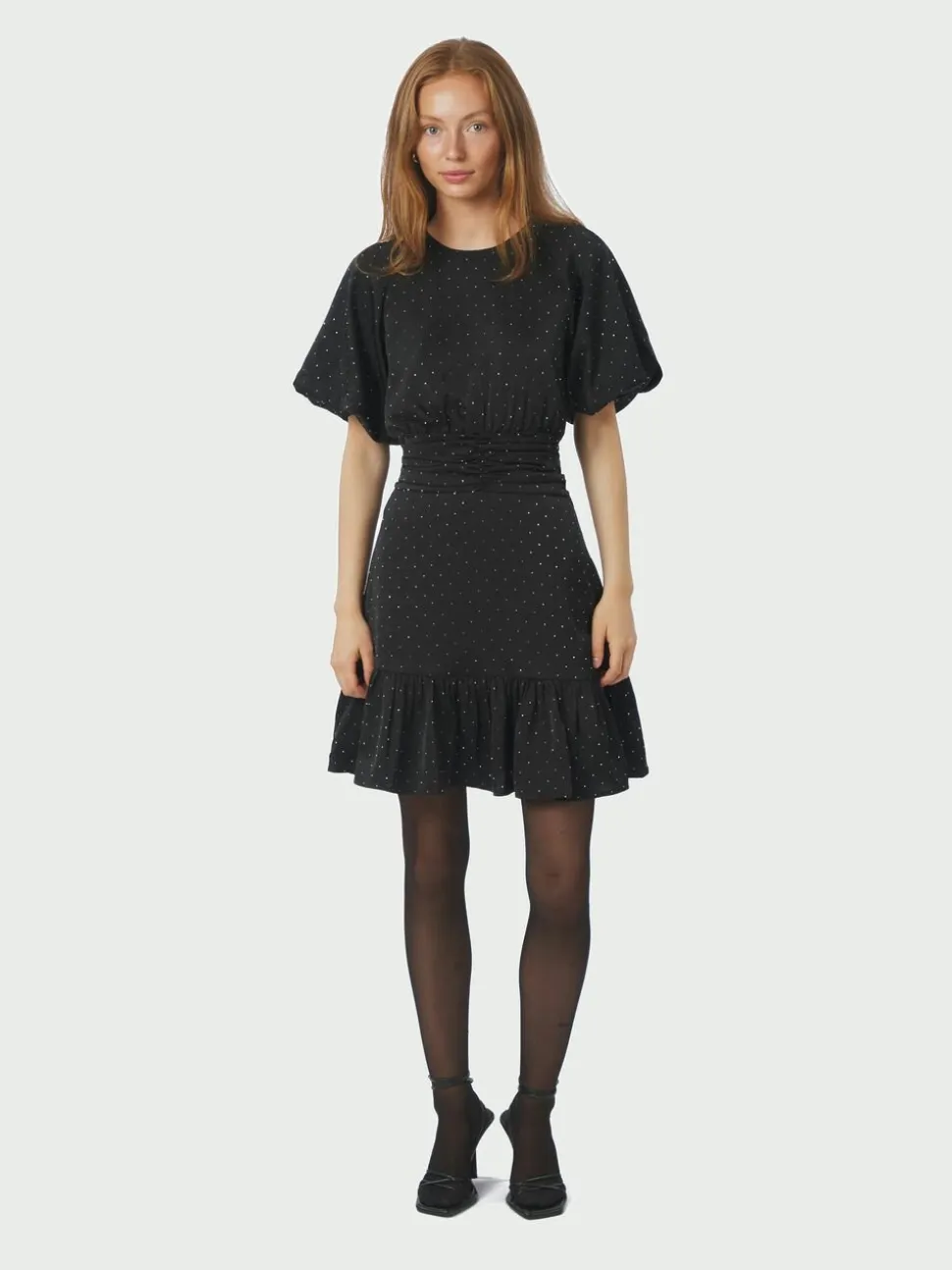 Kort kjole i satin med similisten. Kjolen har rund halsudskæring, korte ærmer med elastik og lukkes med en skjult lynlås i ryggen. Den fremhæver taljen med rynkede detaljer samt smock bagpå. Pasformen er almindelig. Modellen er iført størrelse 36.
