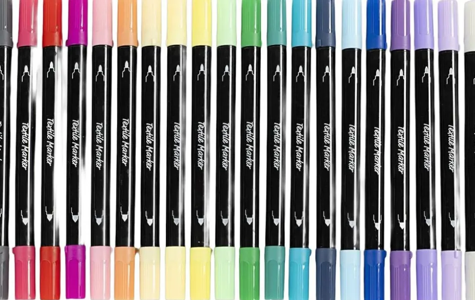 Semidækkende tekstiltuscher med to forskellige filtspidser i hver, som du kan bruge til at dekorere nye og gamle tekstiler med. Tekstiltuscher er gode til kreative genistreger. Med dem kan du bringe alverdens stof til live med unikke mønstre og søde tegninger – og du kan samtidig gå farve-amok! Tusserne er derfor et sikkert hit i alle aldre, både hos tegnglade voksne og kreative børn. Har du brug for en tynd streg til at tegne og skrive med – eller en tyk streg til at farvelægge med? Med vores tekstil markers får du begge muligheder. Så skal det være nemt at dekorere på tekstil og stof, er denne populære tusch et rigtig godt valg.. Ryst tuschen godt før brug, og læg plast eller pap ind i fx t-shirts og muleposer, så farven ikke smitter af på bagsiden. Når farven er tør, kan du strygefiksere med bagepapir over og under tekstilemnet. Efter strygefiksering holder farverne sig flotte i vask op til 40 grader C. Bemærk, at tuschen er perfekt til lyse tekstiler af bomuld m.m.