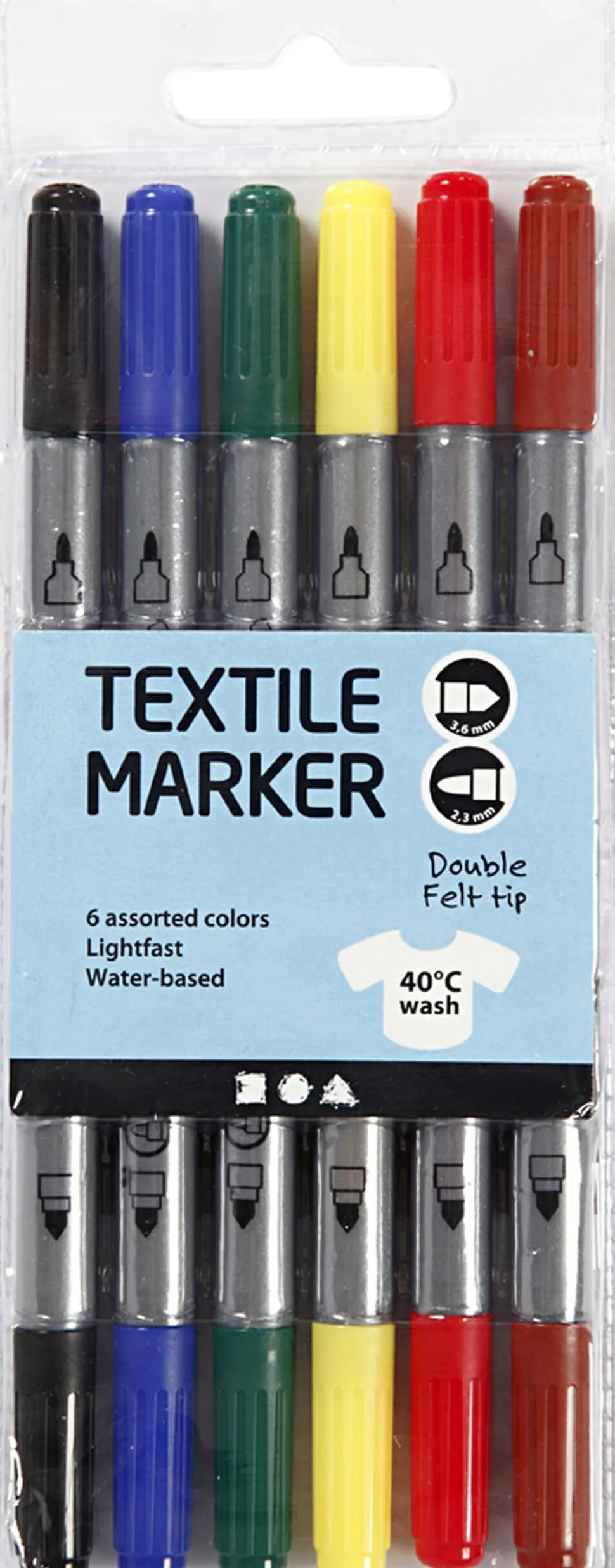 Semidækkende tekstiltuscher med to forskellige filtspidser i hver, som du kan bruge til at dekorere nye og gamle tekstiler med.. Tekstiltuscher er gode til kreative genistreger. Med dem kan du bringe alverdens stof til live med unikke mønstre og søde tegninger – og du kan samtidig gå farve-amok! Tusserne er derfor et sikkert hit i alle aldre, både hos tegnglade voksne og kreative børn. Har du brug for en tynd streg til at tegne og skrive med – eller en tyk streg til at farvelægge med? Med vores tekstil markers fra Colortime får du begge muligheder. Så skal det være nemt at dekorere på tekstil og stof, er denne populære tusch et rigtig godt valg.. Ryst tuschen godt før brug, og læg plast eller pap ind i fx t-shirts og muleposer, så farven ikke smitter af på bagsiden. Når farven er tør, kan du strygefiksere med bagepapir over og under tekstilemnet. Efter strygefiksering holder farverne sig flotte i vask op til 40 grader C. Bemærk, at tuschen er perfekt til lyse tekstiler af bomuld m.m..