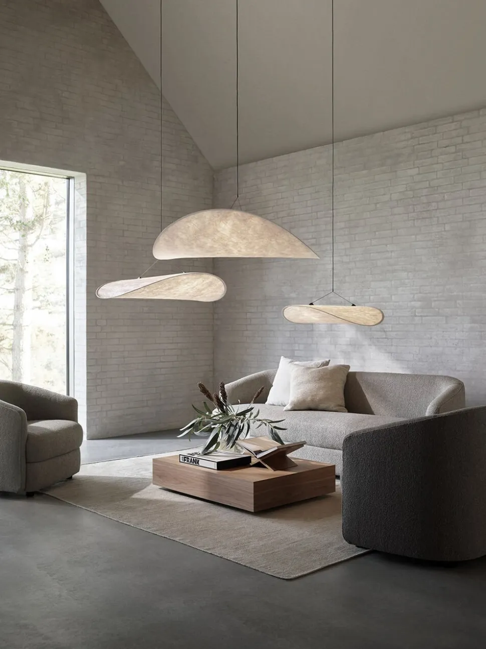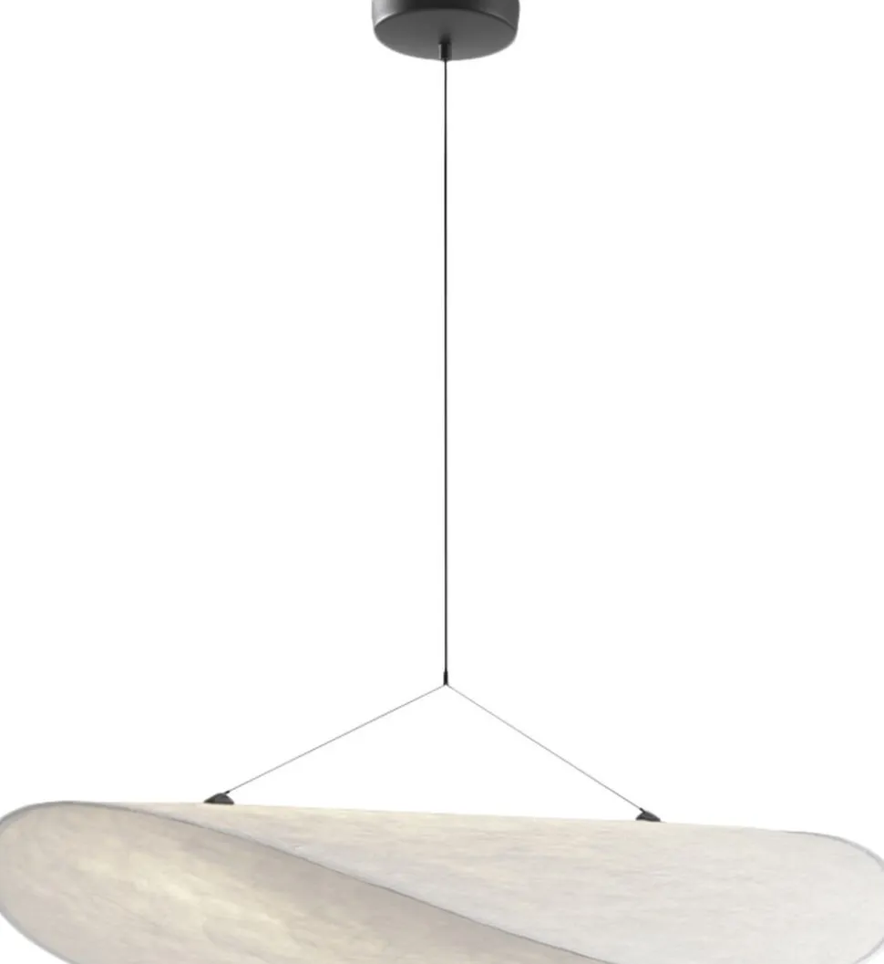 Tense pendel strækker sig ud som en blød sky. Lampens overflade er fremstillet i et materiale der i sin farve og struktur, minder og et stykke hvidt papir. Materialet er i virkeligheden det innovative materiale