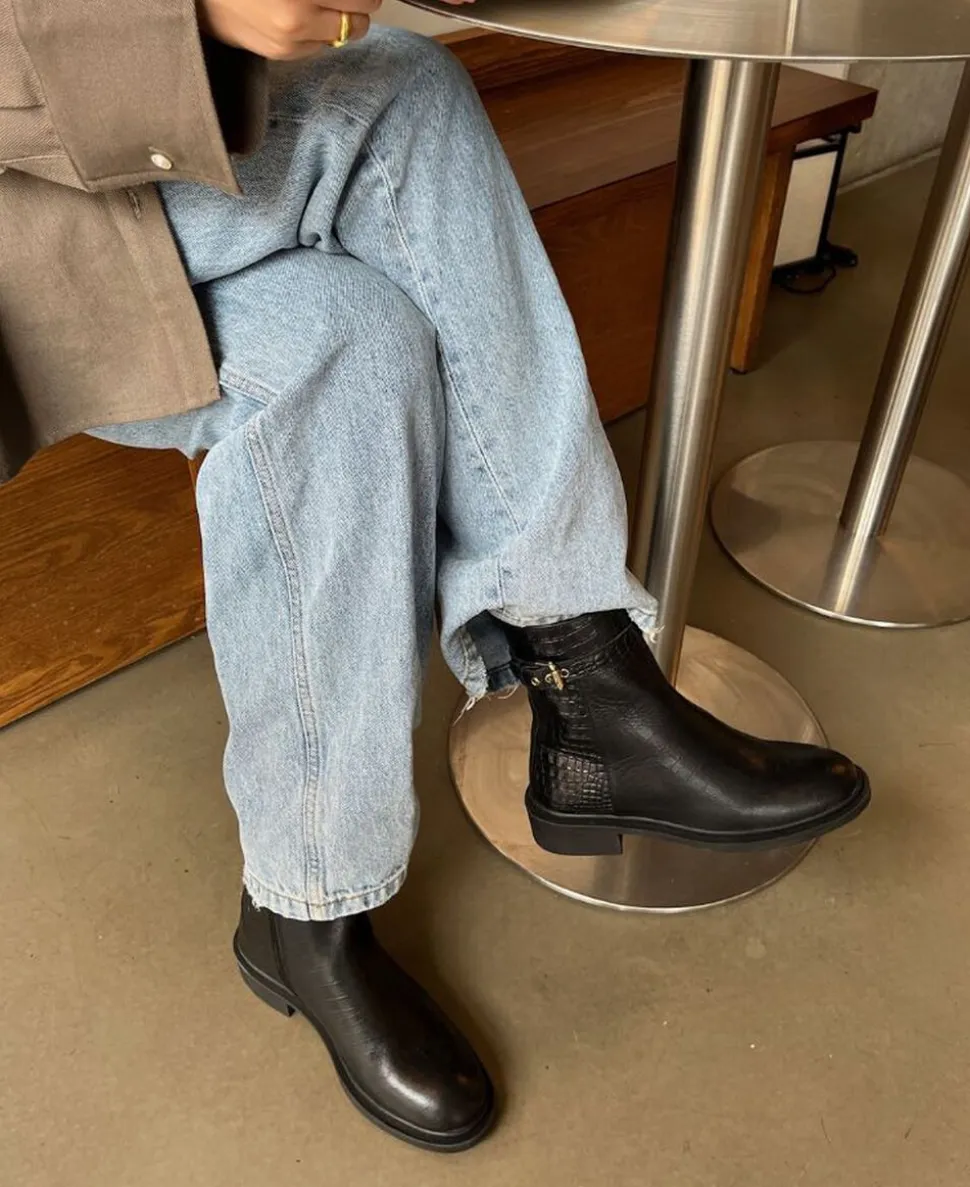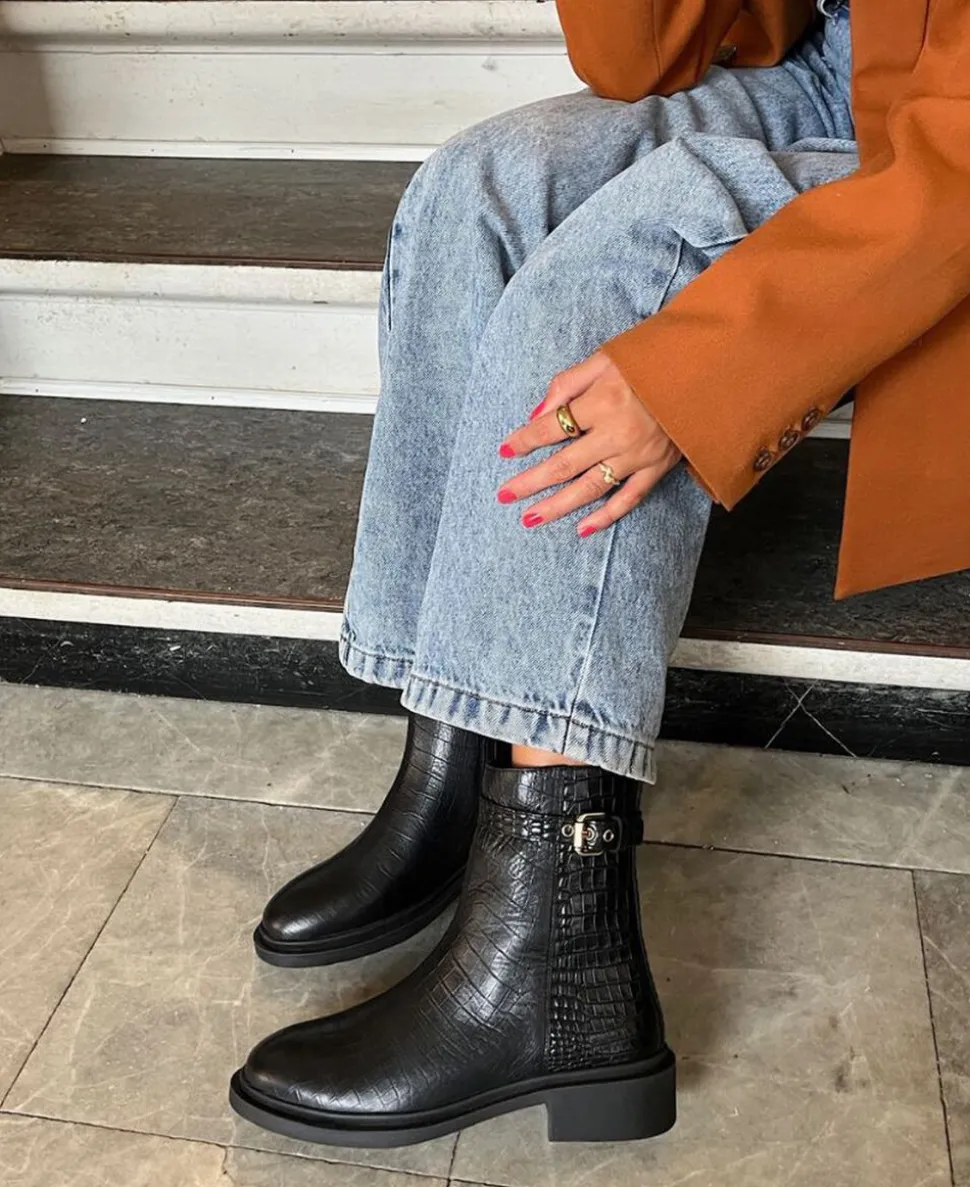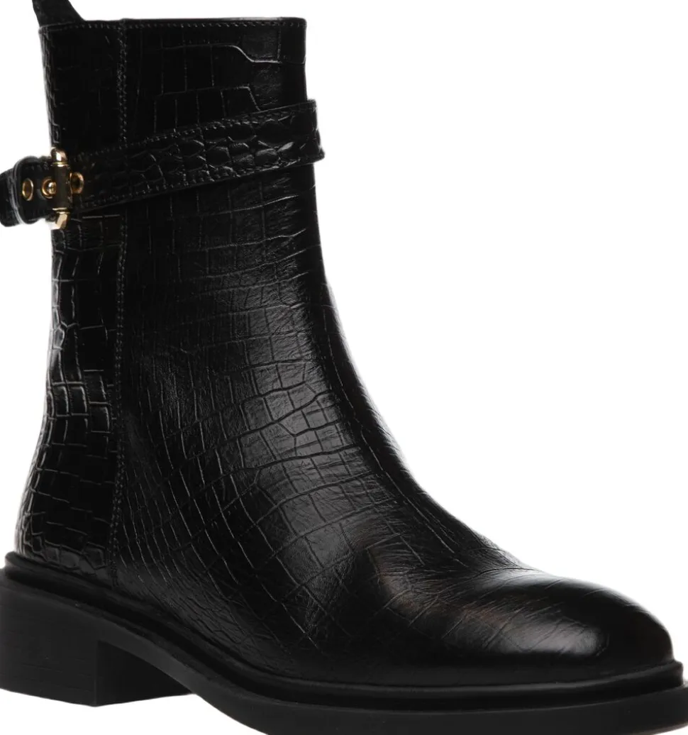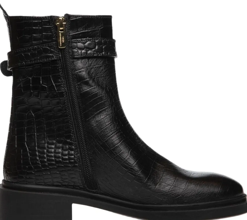 En stilfuld ankelstøvle i præget croco-skind med et eksklusivt og moderne udtryk. Det dekorative spænde i forgyldt guld tilfører et raffineret twist, som gør støvlen ekstra elegant. Modellen har lynlås på indersiden, der sikrer nem af- og påtagning, og den solide TR-sål giver god komfort.