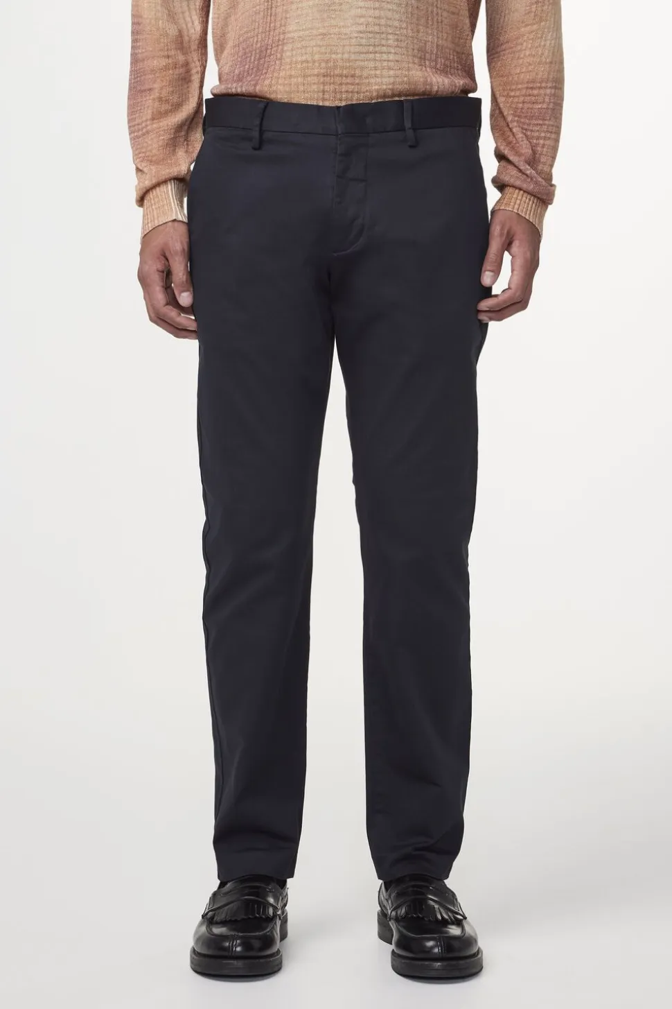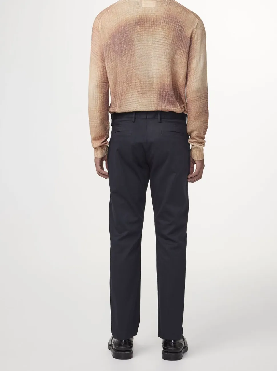 Theo er en chino i hjertet, men med de formelle elementer i en kjolebuks. Den er fremstillet i BCI-fremstillet børstet bomuld fra den italienske mølle Progetto Uno. Disse alsidige bukser med mellemhøj talje har en indsnævret pasform. Den er afsluttet med en skarp fold ved benet og usynlig oplægning