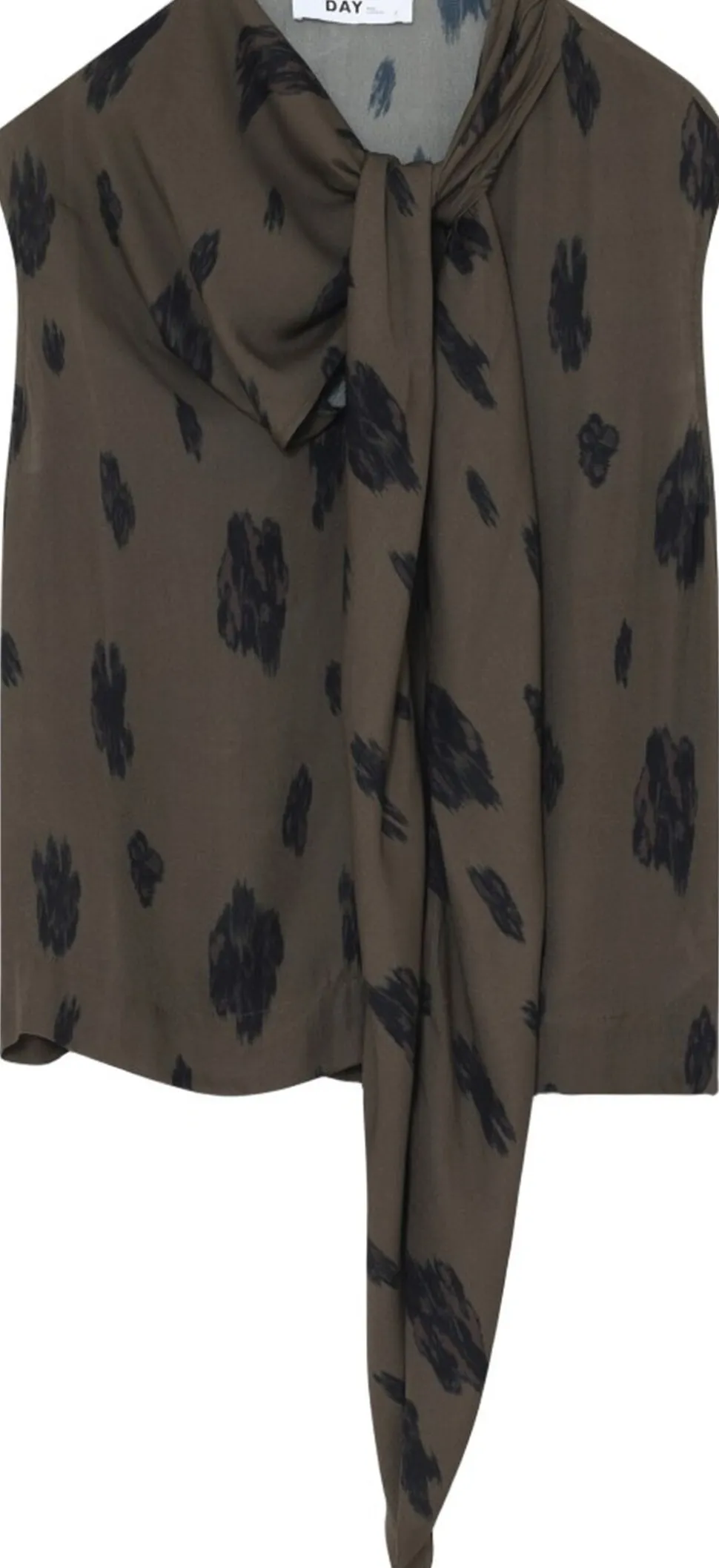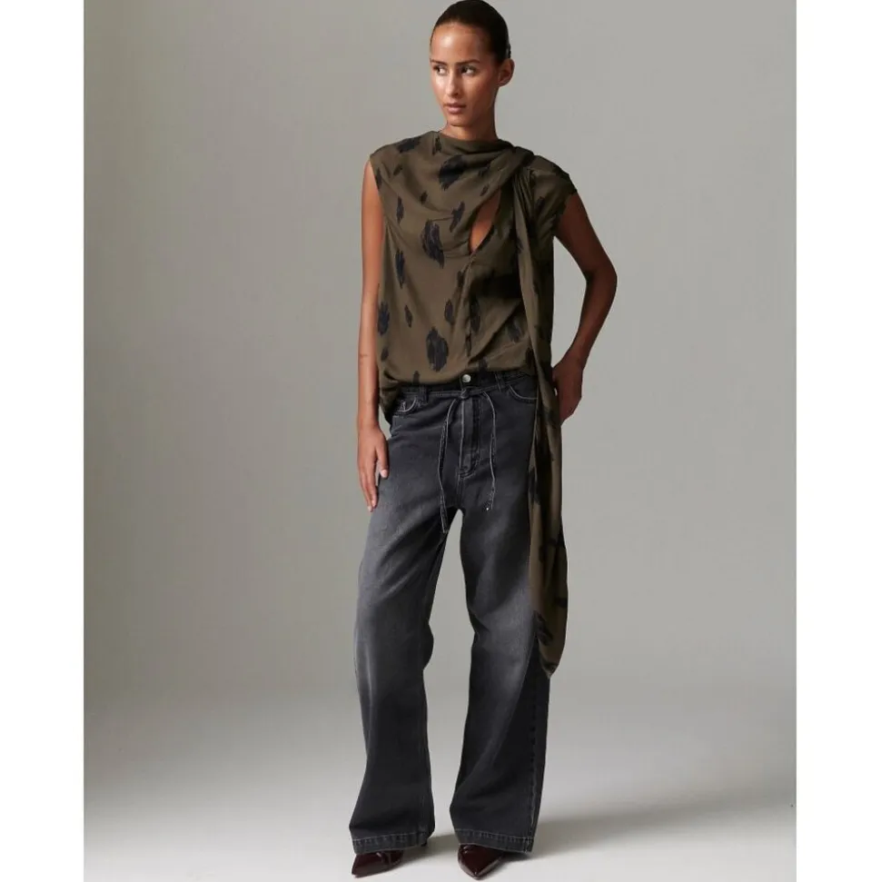 Denne top uden ærmer har et forlænget halstørklæde, der draperer asymmetrisk hen over brystet. Toppen har en almindelig pasform