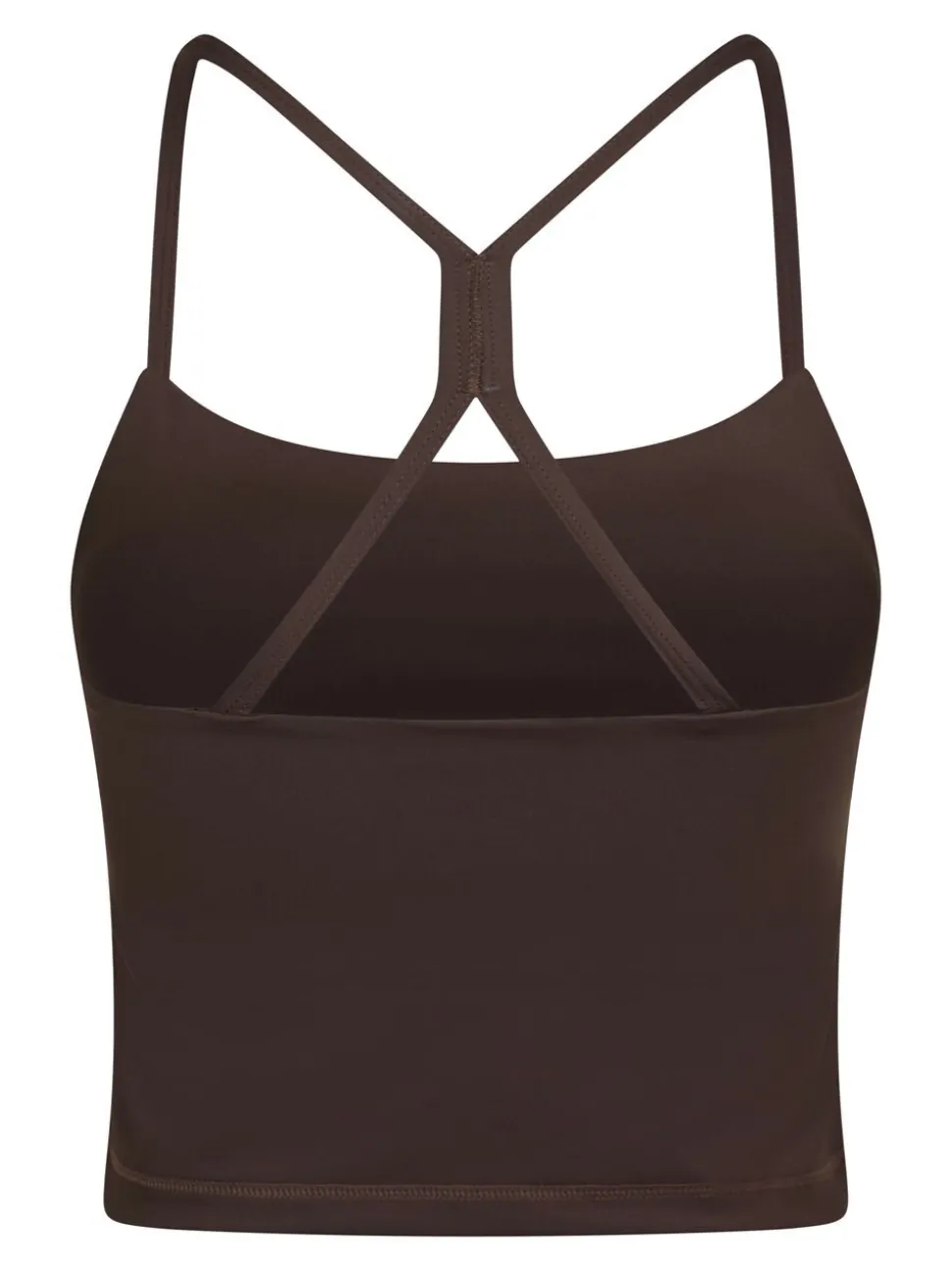Kort top uden ærmer. Toppen har rund halsudskæring, tynde stropper, der krydser på ryggen, samt forede skåle. Den er lavet i et strækbart materiale og har en tætsiddende pasform. Modellen er iført størrelse 36.