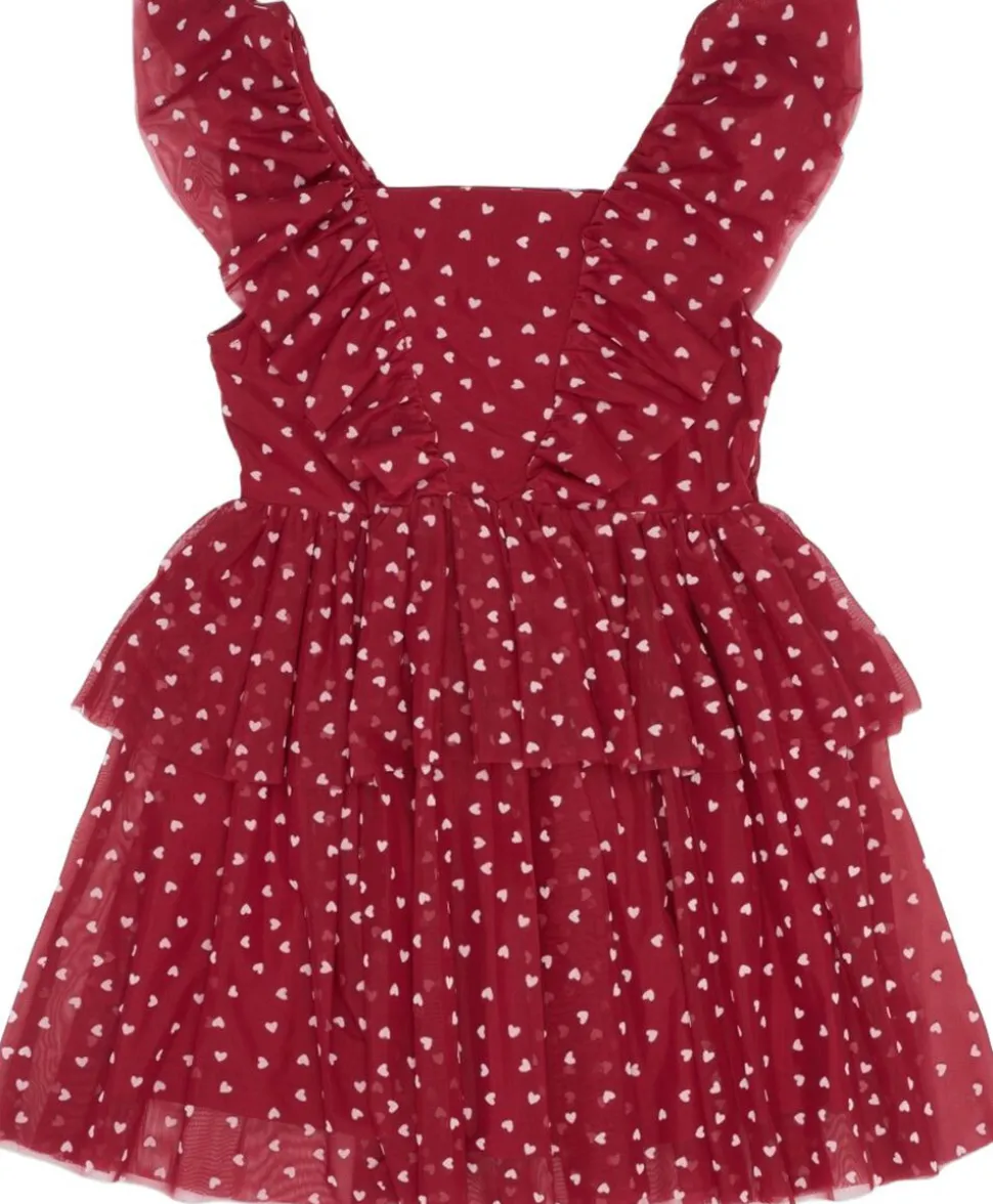 Sød og romantisk kjole fra THE NEW, der emmer af elegance og leg. Kjolen har fine flæsedetaljer ved skuldrene og skørtet, som giver et smukt, voluminøst udtryk. Det lette mesh-stof er dekoreret med små hjerter. Kjolen er opbygget i to lag med blødt og åndbart bomuld på indersiden, samt et ydre lag af blødt, gennemsigtigt mesh-stof. Den har en praktisk lynlås i siden, som gør den nem at tage af og på, og den elastiske talje giver en god og fleksibel pasform. Perfekt til særlige anledninger, hvor der skal lidt ekstra charme til. – Kort kjole med en længde der slutter lige over knæene. – Normal pasform med a-snit og elastisk der fremhæver taljen. – Ærmeløs. – Flæsekant langs stropperne. – Sødt hjerteprint. – Lynlås i siden af kjolen.