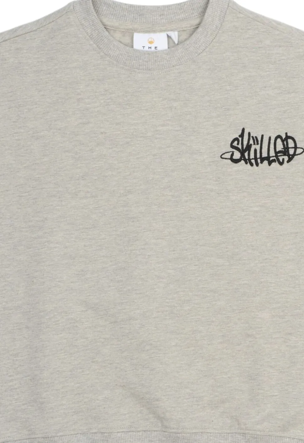 Denne sweatshirt fra THE NEW er det perfekte mix af komfort og stil. Den har en afslappet, oversized pasform, der giver et moderne og casual udtryk. Trøjen er designet med ribkant ved hals, ærmer og bund, hvilket sikrer en god pasform og et klassisk sweatshirt-look. På brystet står der “Skilled” og på ryggen er der et stort print af samme tekst og to blå terninger som giver et sejt look til trøjen. Perfekt til både afslappede dage og lag-på-lag-styling. – Oversized pasform – Ribkant ved hals, ærmer og bund – Grafiske detaljer foran