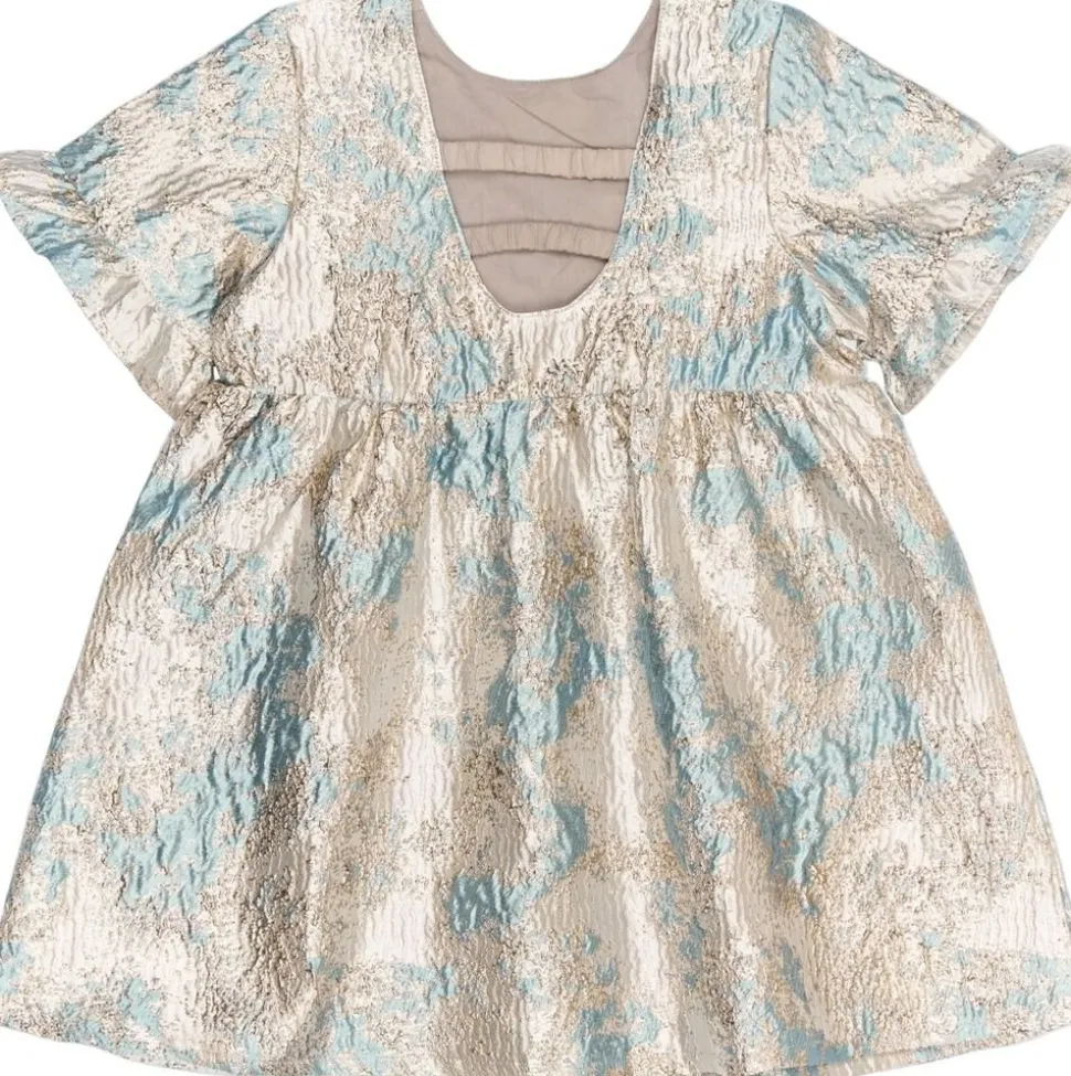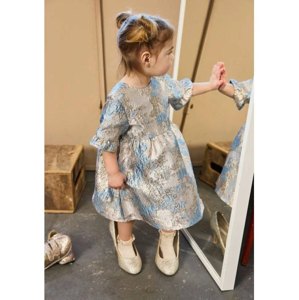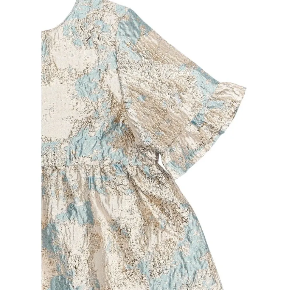 Denne kjole fra THE NEW Siblings er en virkelig elegant style, der er perfekt til særlige lejligheder. Den er lavet i smukt jacquardstof med et skinnende blomsterprint og har en vid A-formet pasform med let volumen og korte flæseærmer, som tilføjer et raffineret og festligt udtryk. Kjolen er både stilfuld og behagelig, så de små kan stråle og samtidig bevæge sig frit og lege. – Skinnende jacquard med blomsterprint – A-formet silhuet med let volumen – Korte flæseærmer – Perfekt til festlige lejligheder og fejringer – Elegant og komfortabel design til små modeelskere
