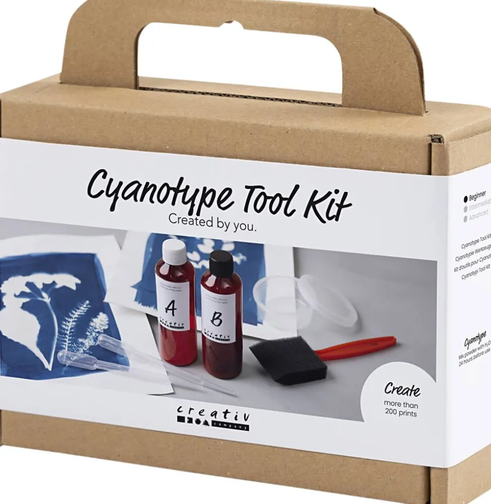 Med dette kit kan du nemt prøve kræfter med cyanotypi. Indeholder alt det tilbehør du skal bruge, og al den vejledning du behøver. Det eneste, du selv skal have klar, akvarelpapir eller bomuldsstof. Drømmer du om at skabe dine egne cyanotypi-prints? Så prøv vores smarte tool kit. Her får du det vigtigste tilbehør til at skabe smukke, blå prints ved hjælp af sollys. Teknikken både enkel og fascinerende. Tag først de to flasker med jernsalte (ammoniumjerncitrat og kaliumferricyanid) mix dem med vand og lad dem stå 24 timer inden brug. Resultatet er en lysfølsom væske, som du selv kan aktiverer med solens kraft. Prøv det fx på papir, stof, papir eller æg. De dækkede områder forbliver kridhvide, mens solens stråler forvandler de eksponerede dele til dybe blå toner. Husk: Brug handsker og evt. briller, da væsken kan genere øjne og hud.