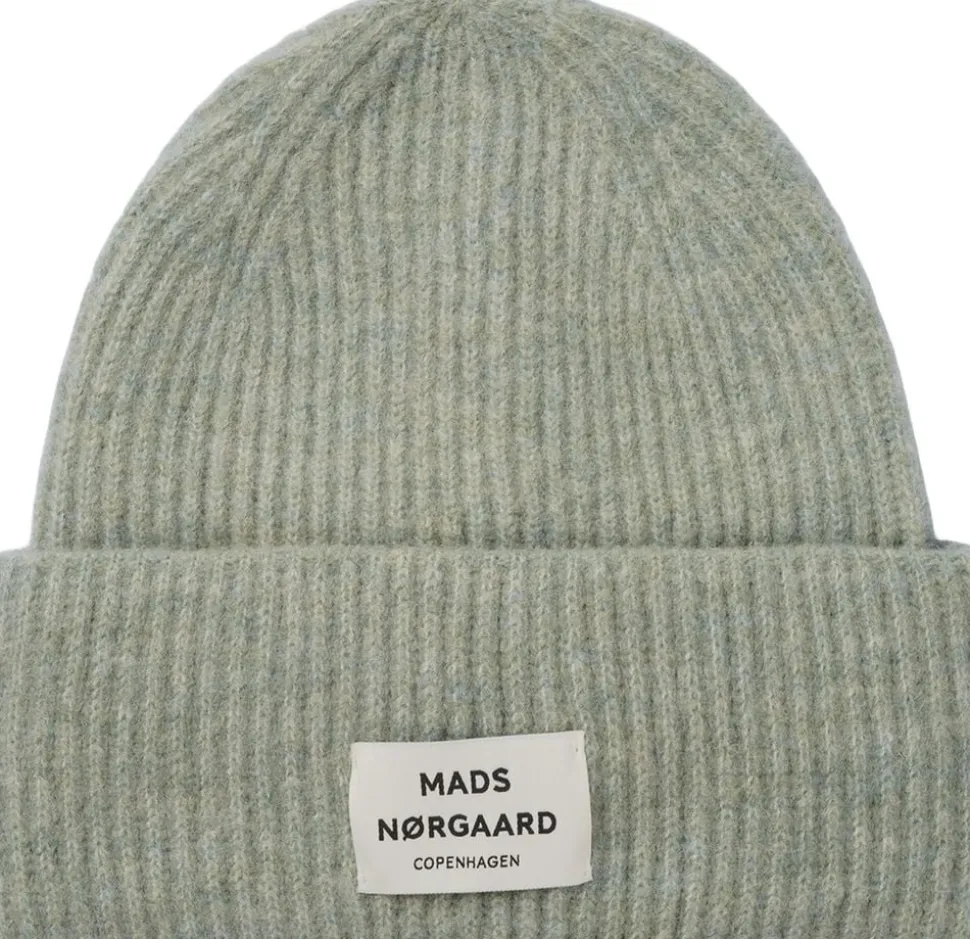 Blød, ribstrikket hue med bredt dobbelt-ombuk og påsyet logolabel.