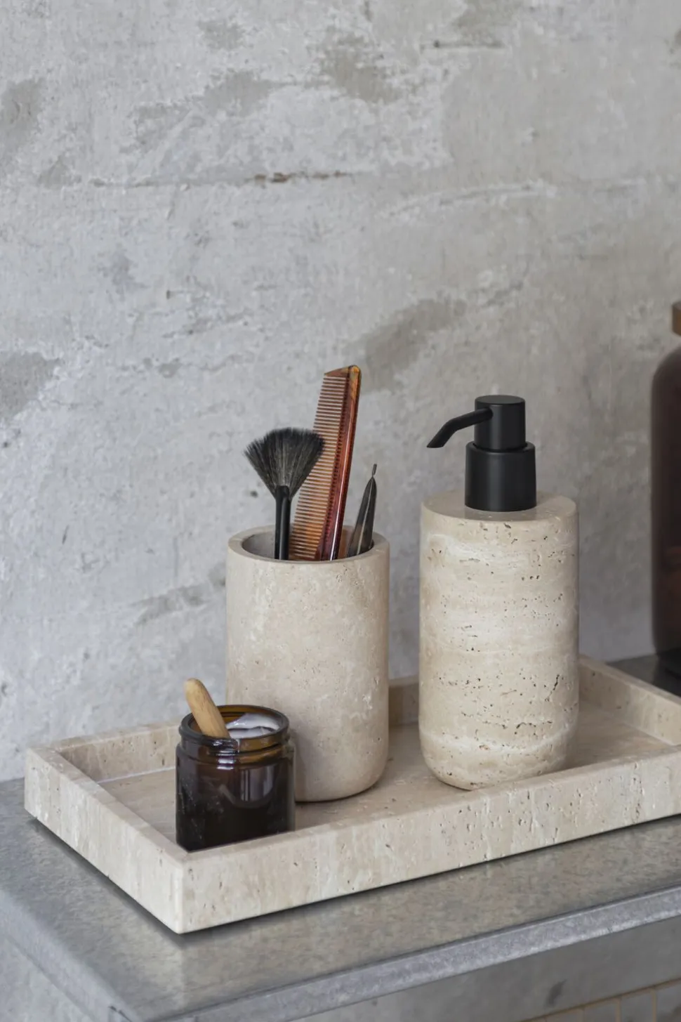 TRAVERTIN-tandbørsteholderen fra Mette Ditmer er skabt til at holde styr på tandbørster, makeupbørster eller andre småting, der skal organiseres på badeværelset. Med sit enkle og funktionelle design gør kruset det nemt at skabe orden og tilfører samtidig et stilfuldt element til rummet.
