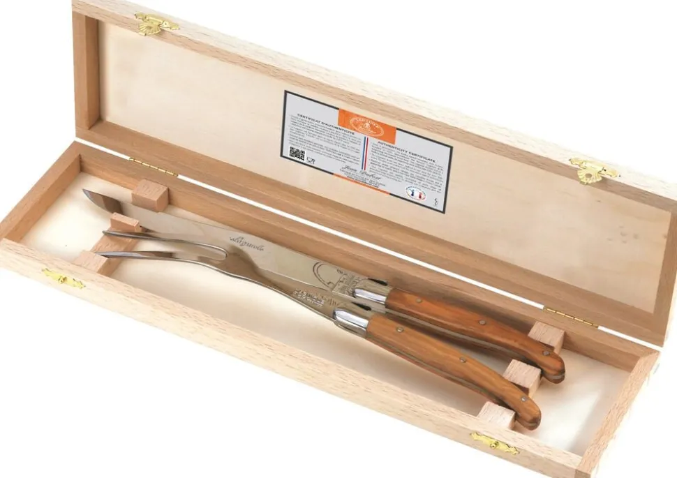 Klassisk udskærersæt fra Laguiole i lukket trææske. Perfekt til servering af stege eller store udskæringer – med træhåndtag og tidløst design.