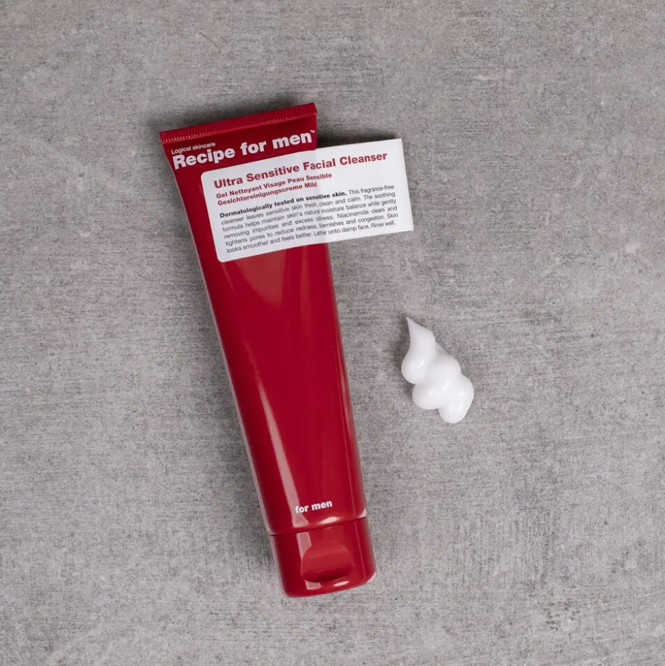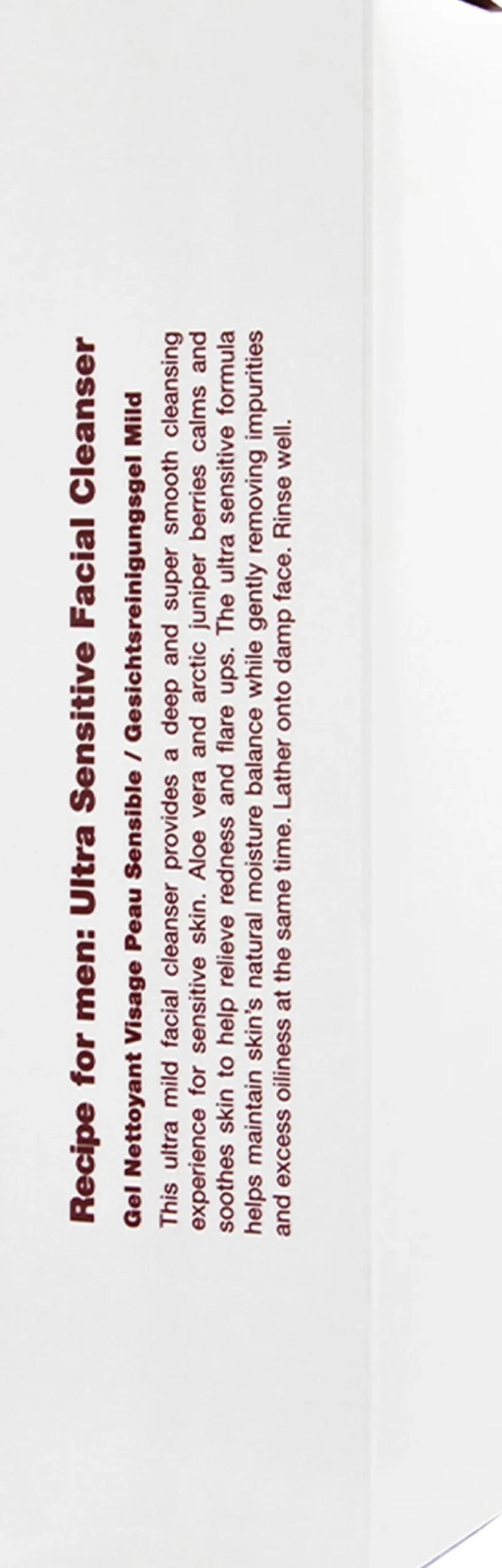 Recipe for men Ultra Sensitive Facial Cleanser er en mild ansigtsvask til følsom hud. Recipe for men Ultra Sensitive Facial Cleanser hjælper med at berolige og undgå rødhed og irritation samtidig med at huden bliver vasket rent for urenheder.