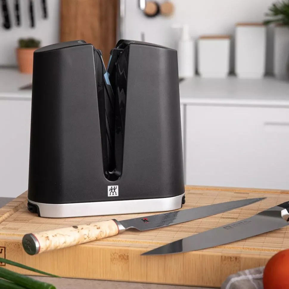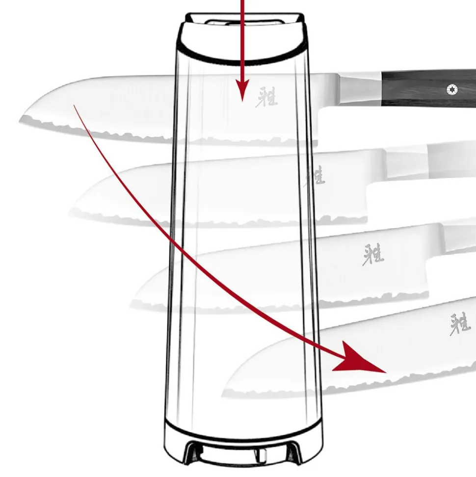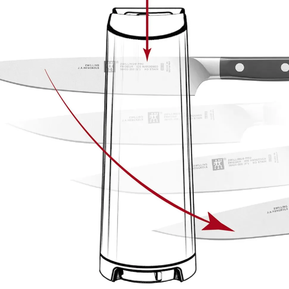 Unik knivsliber med kan slibe både europæiske og japanske knive takket være de medfølgende adaptere. Knivsliberen sliber med en kvalitet, der kan sammenlignes med professionelle slibesten.