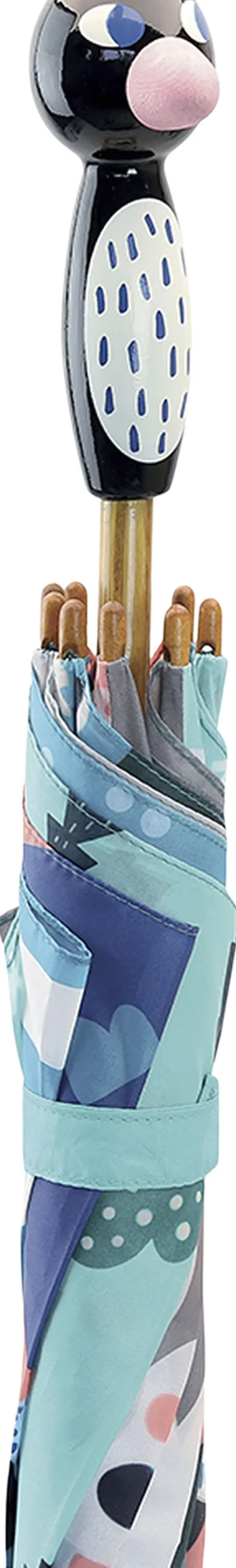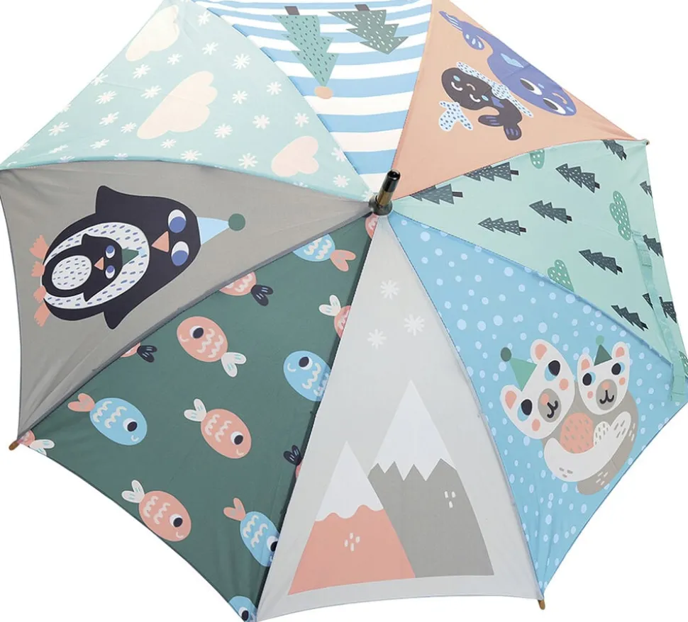 Paraply dekoreret med fine illustrationer af vintermotiver og pingviner, designet af den danske kunstner Michelle Carslund. Håndtaget er en sort pingvin. Paraplyen er produceret i Frankring.