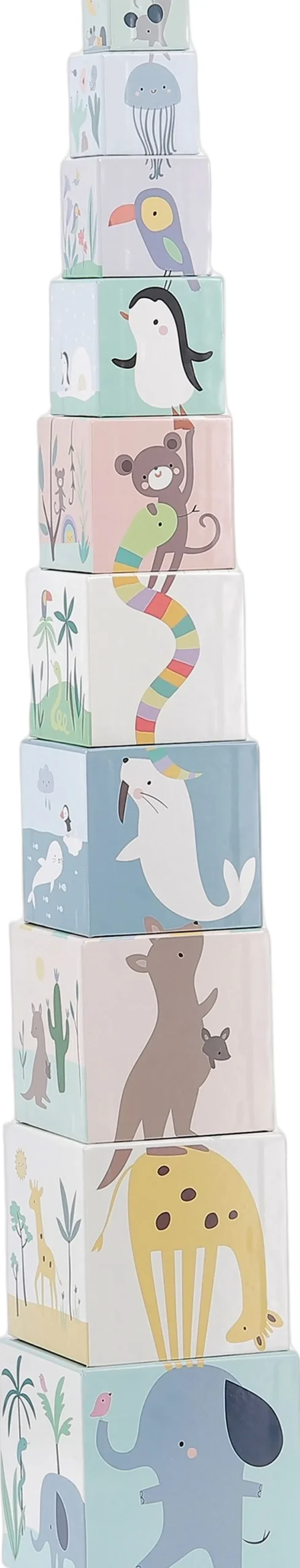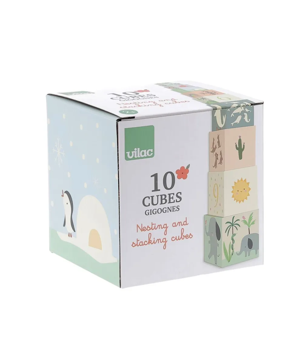10 kraftige kuber med illustrationer af et univers befolket af dyr, ting at se i naturen og numrene 1-10.