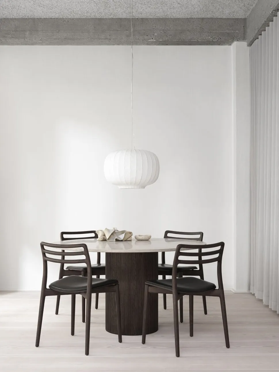 Det runde Cabin bord er et mellemstørrelse bord til spisestuen eller køkkenet. Bordet har en base af solid, lakeret mørk eg med en bordplade af marmor. Bemærk at hver marmorplade har unikke visuelle karakteristika.