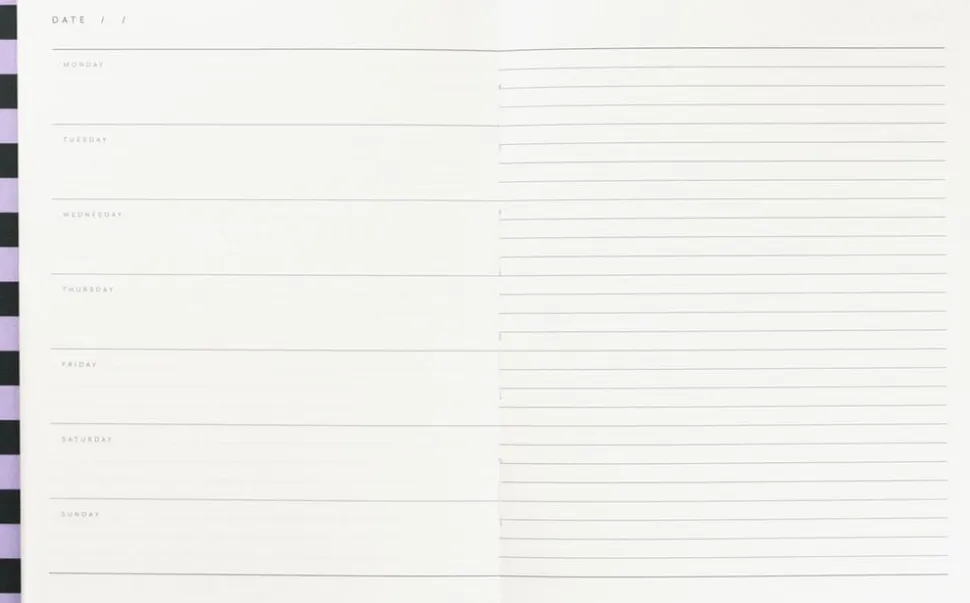 Softcover Weekly Planner fra Notem Studio. Bogens ryg er syet og ikke fæstnet til coveret, hvilket giver en plan flade når bogen åbnes. Indhold: Ugeplan (venstre) / noter (højre) 160 sider, Linjeret. Farve: Rosa og grøn stribe. Mål: 150 x 190 mm. Designet i Danmark, produceret i Europa.