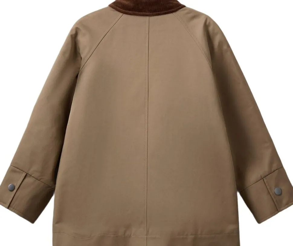 Beige klassisk jakke med fløjlskrave, raglanærmer, knaplukning, forlommer med knaplukning og logodetalje og skjult lynlås