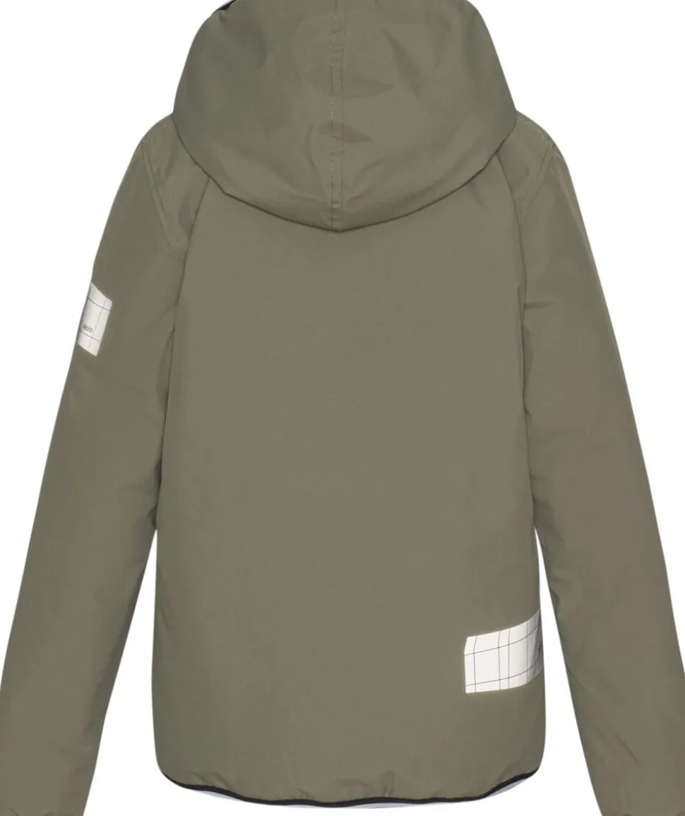 Smart mørkegrøn vind- og vandtæt allround jakke. Jakken har en fleeceforet aftagelig hætte, lommer i siderne, elastik ved ærmerne, og har den velkendte Molo stjerne refleks bagpå samt på det ene ærme, så børnene ses i mørket. Bukserne har desuden foret med en invendig flat padding, som gør dem bløde og hjælper til at holde på varmen. Ydermateriale, for, samt inderstof er fremstillet af delvist genanvendt polyester fra brugte plastikflasker og andet restaffald.Herved bruges der langt færre ressourcer samt en væsentlig mindre udledning af CO2.Miljøvenlig vand- og smudsafvisende coating uden brug af kemikalier som PFOS, PFOA og lign. Vandsøjletryk: 5.000 mm. Åndbarhed: 5.000 g/m2/24t.