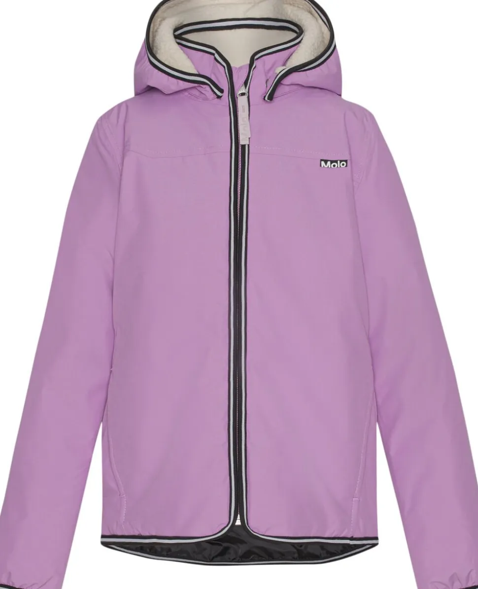 Smart mørkegrøn vind- og vandtæt allround jakke. Jakken har en fleeceforet aftagelig hætte, lommer i siderne, elastik ved ærmerne, og har den velkendte Molo stjerne refleks bagpå samt på det ene ærme, så børnene ses i mørket. Bukserne har desuden foret med en invendig flat padding, som gør dem bløde og hjælper til at holde på varmen. Ydermateriale, for, samt inderstof er fremstillet af delvist genanvendt polyester fra brugte plastikflasker og andet restaffald.Herved bruges der langt færre ressourcer samt en væsentlig mindre udledning af CO2.Miljøvenlig vand- og smudsafvisende coating uden brug af kemikalier som PFOS, PFOA og lign. Vandsøjletryk: 5.000 mm. Åndbarhed: 5.000 g/m2/24t.