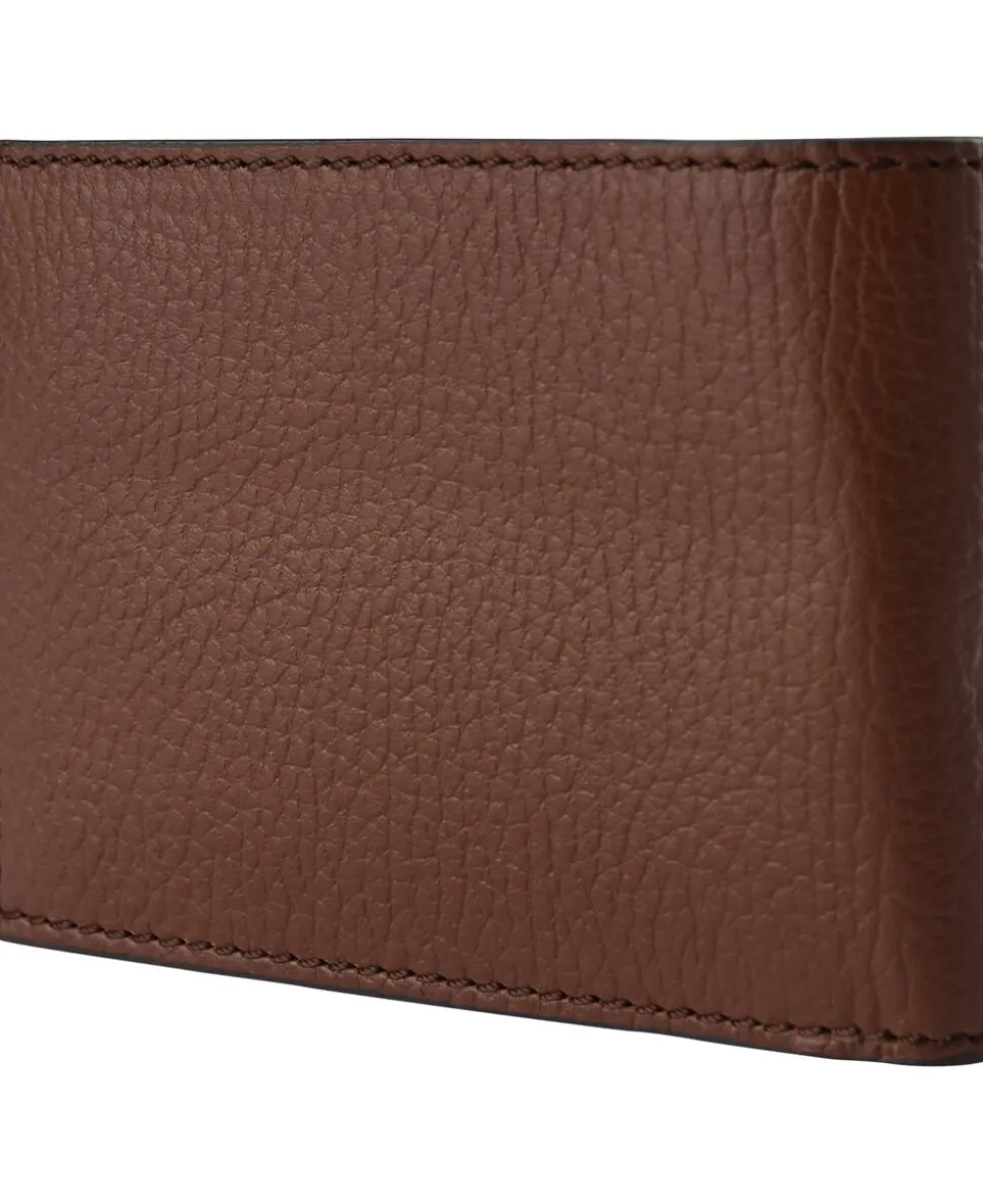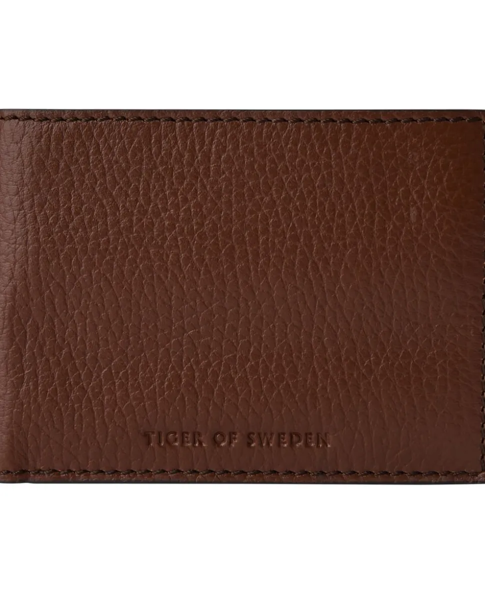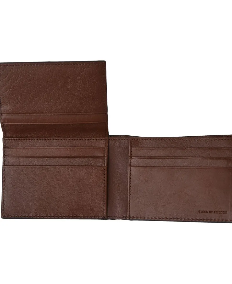 Folded wallet in soft grainy leather with smooth leather trimmings. Large open note compartment at top. Inside features three open pockets and ten card slots. RFID anti-skimming lining. Embossed Tiger of Sweden logo at the front. Size: 8 x 11 cm