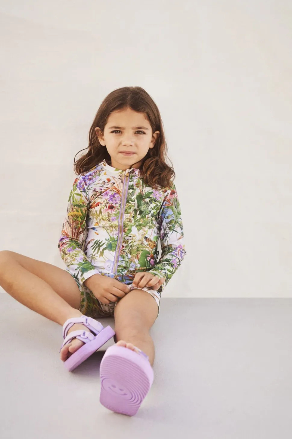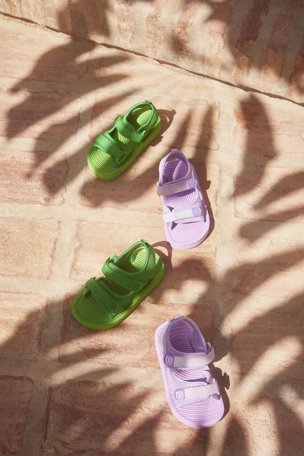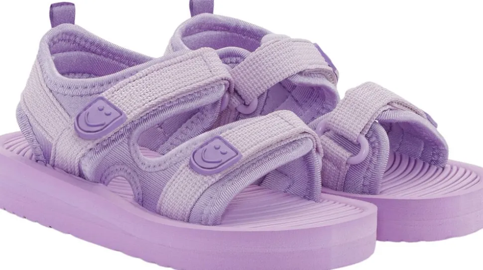 Lette og sporty lilla sandaler med en blød skumsål. Sandalerne er udstyret med komfortable neoprenpaneler, der sikrer foden, samt praktiske velcrolukninger ved anklen og over forfoden, hvilket gør dem nemme at tage af og på.