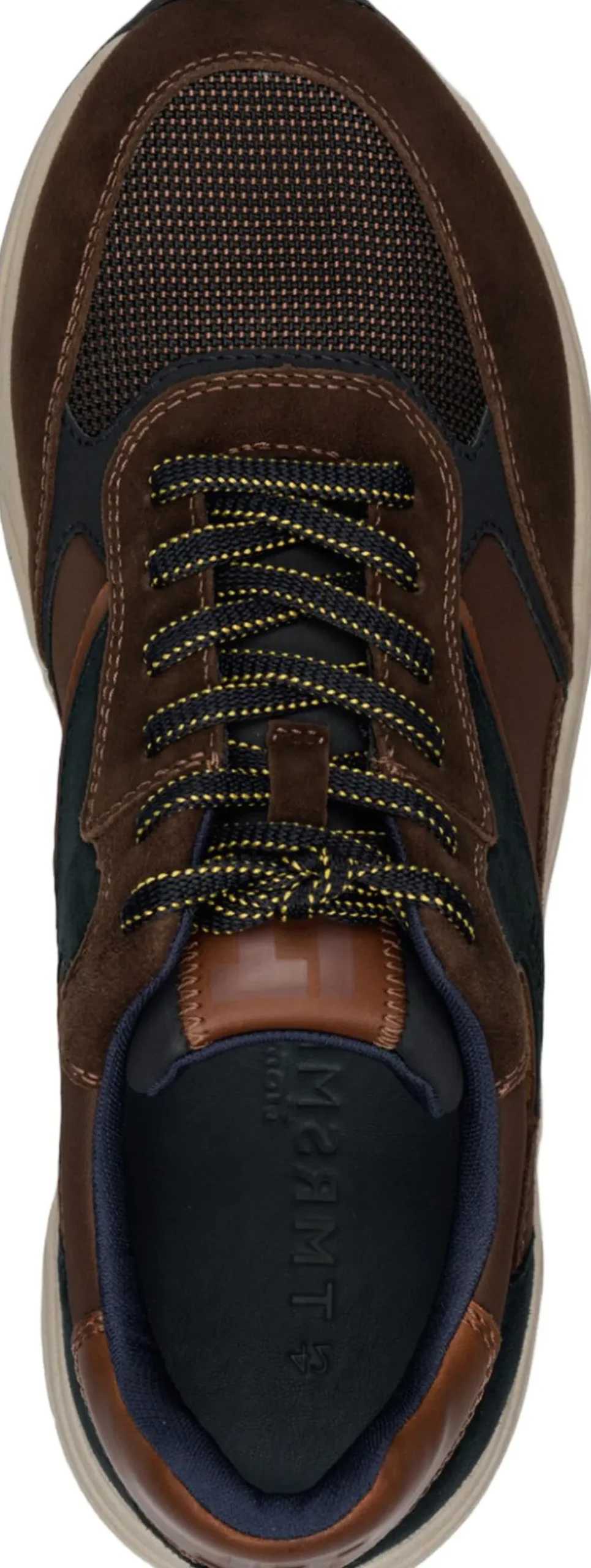 Mørkebrun ruskinds sneaker med navy detaljer. Sålen er creme farvet. De er skind foeret