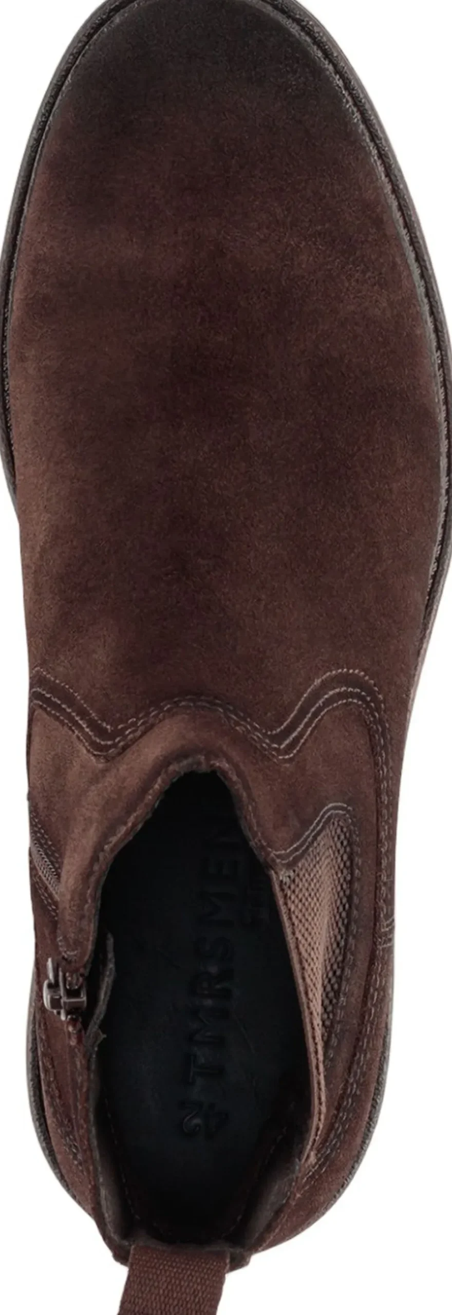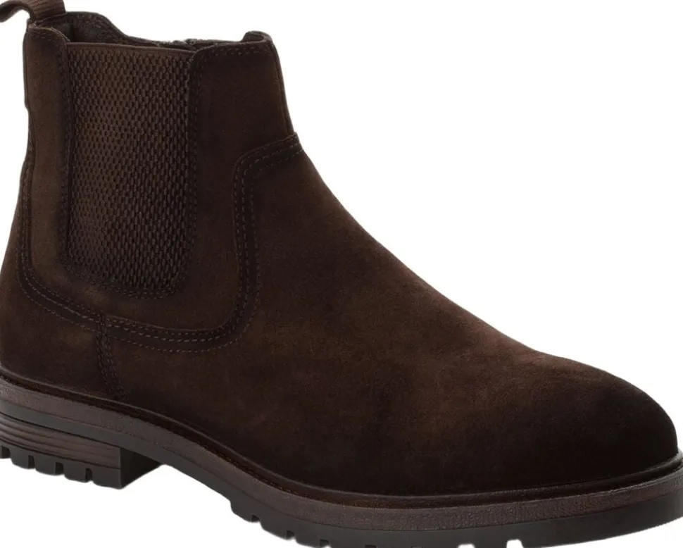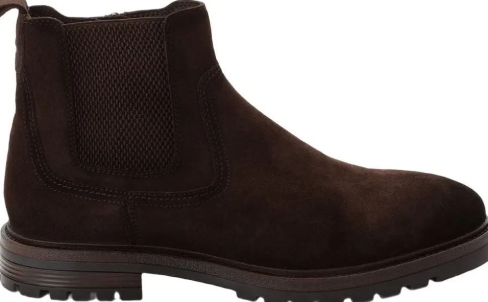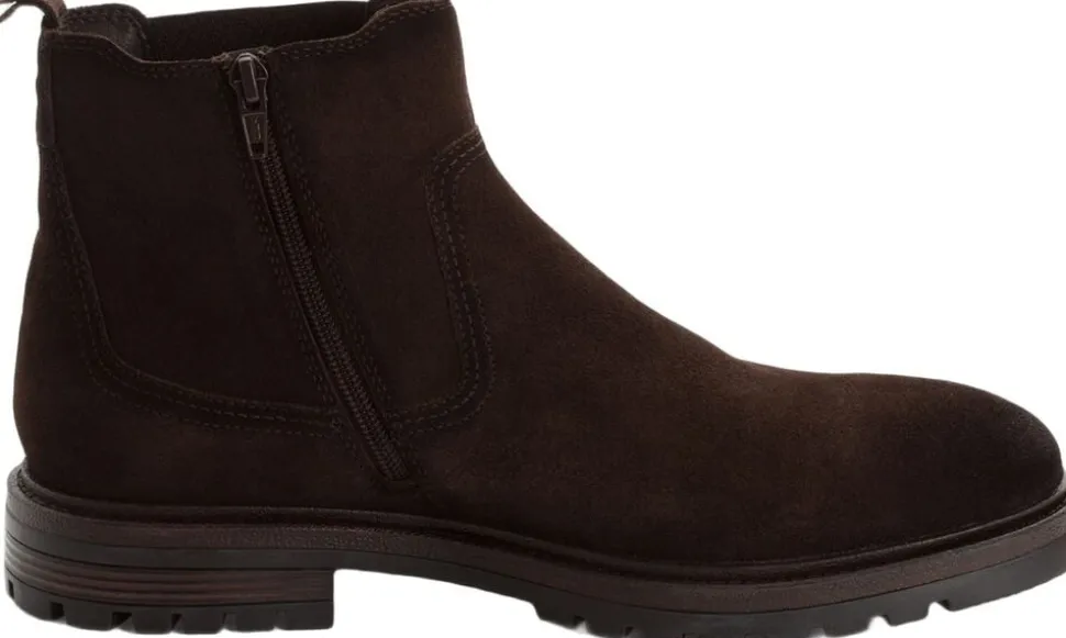 Mørkebrun ruskinds chelsea støvle med indvendig lynlås på en let profil gummisål- Støvlen er skind. Skaft højde er 14,5 cm