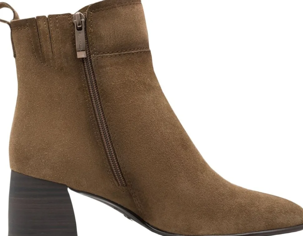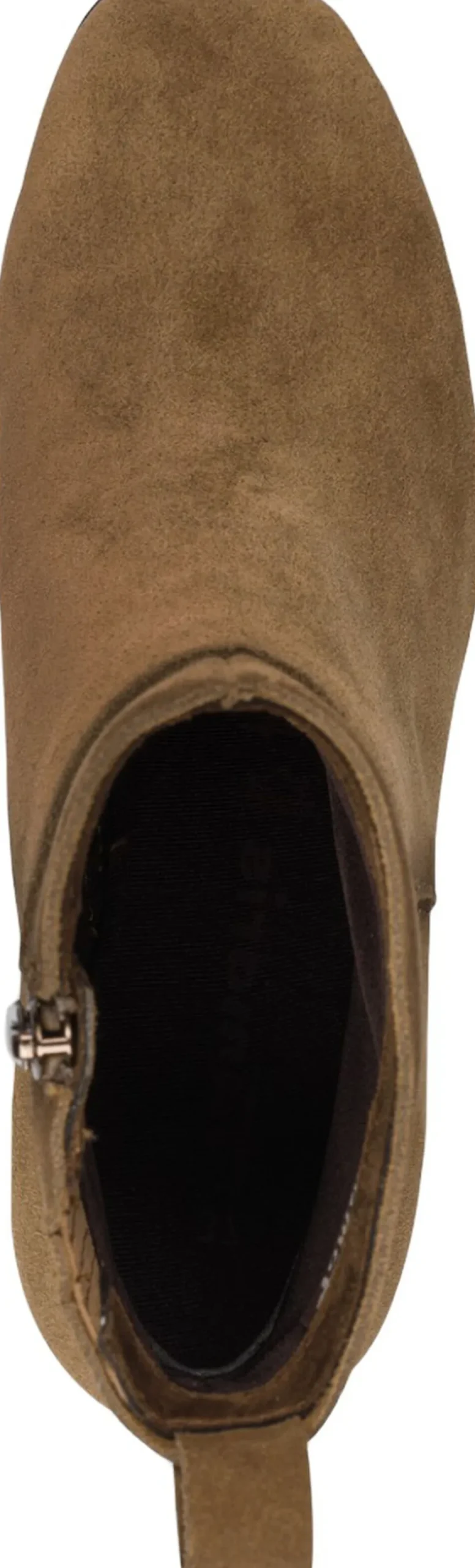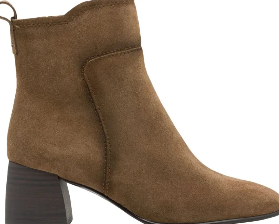 Enkel kort støvle i camel farvet ruskind, med indvendig lynlås og på en flot elegant blokhæl på 55 mm. Skafthøjde er 14 cm og der er Antislide og Antichok i hælen. I dæksålen er der Touch it effekt