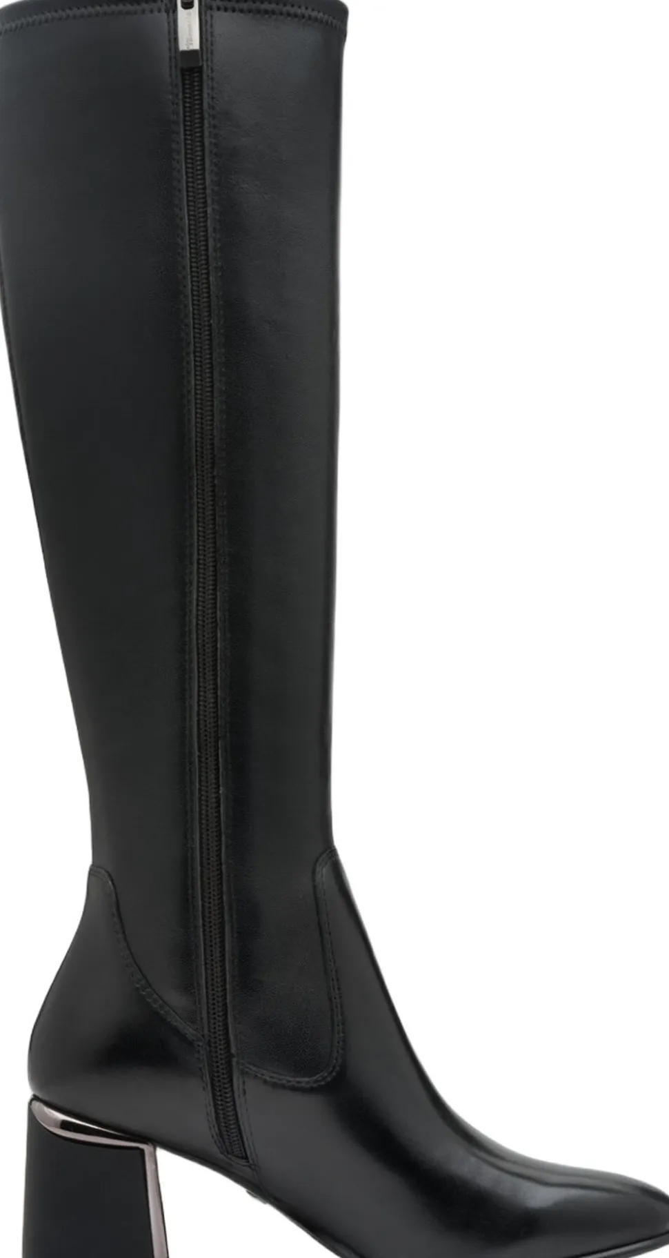 Langskaftet strechstøvle med sølvdetalje på hælen. Indvendig lynlås og antislide og antichok effekt i hælen. Skafthøjden er 40 cm og hælhøjden er 60 mm