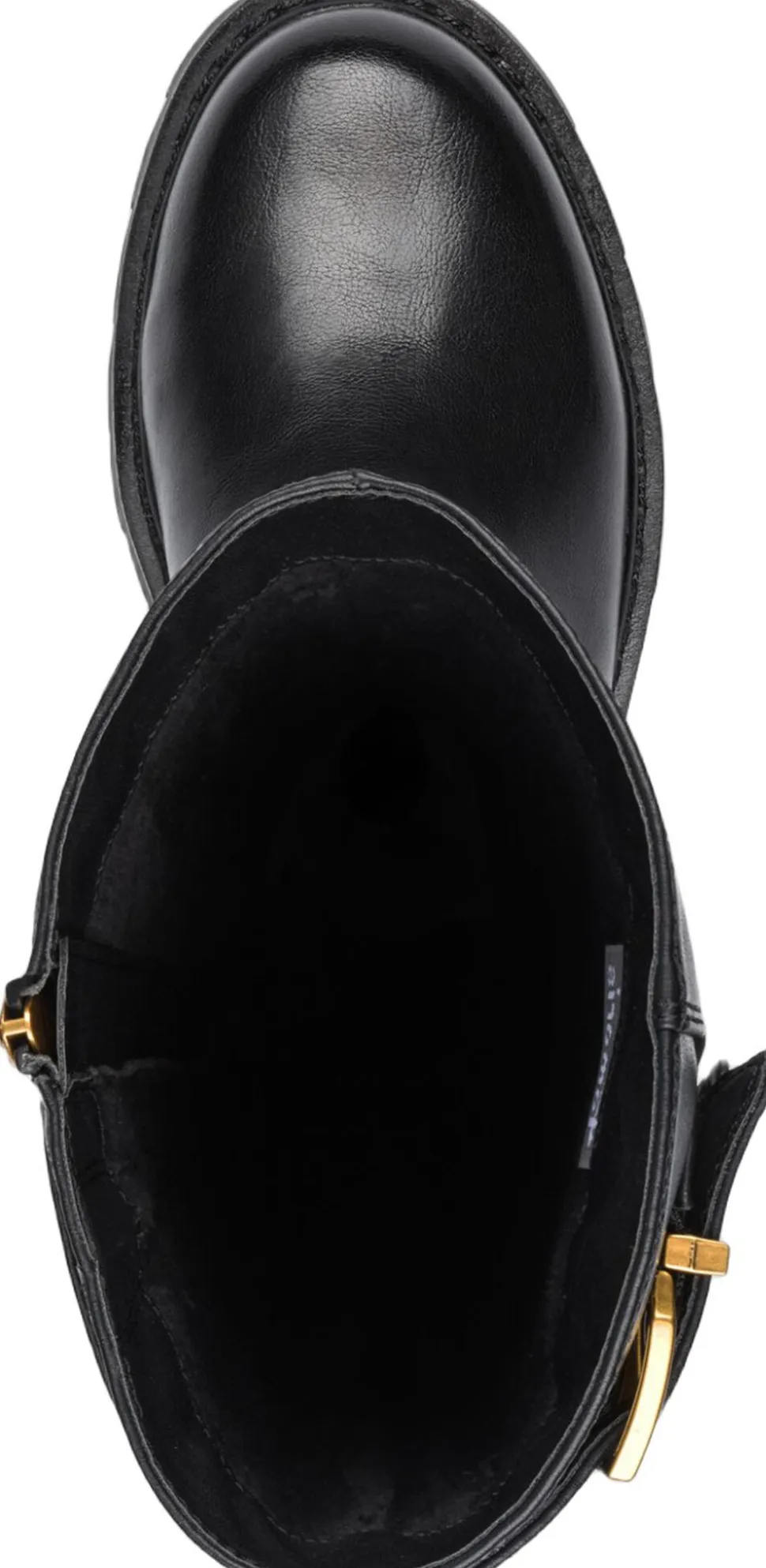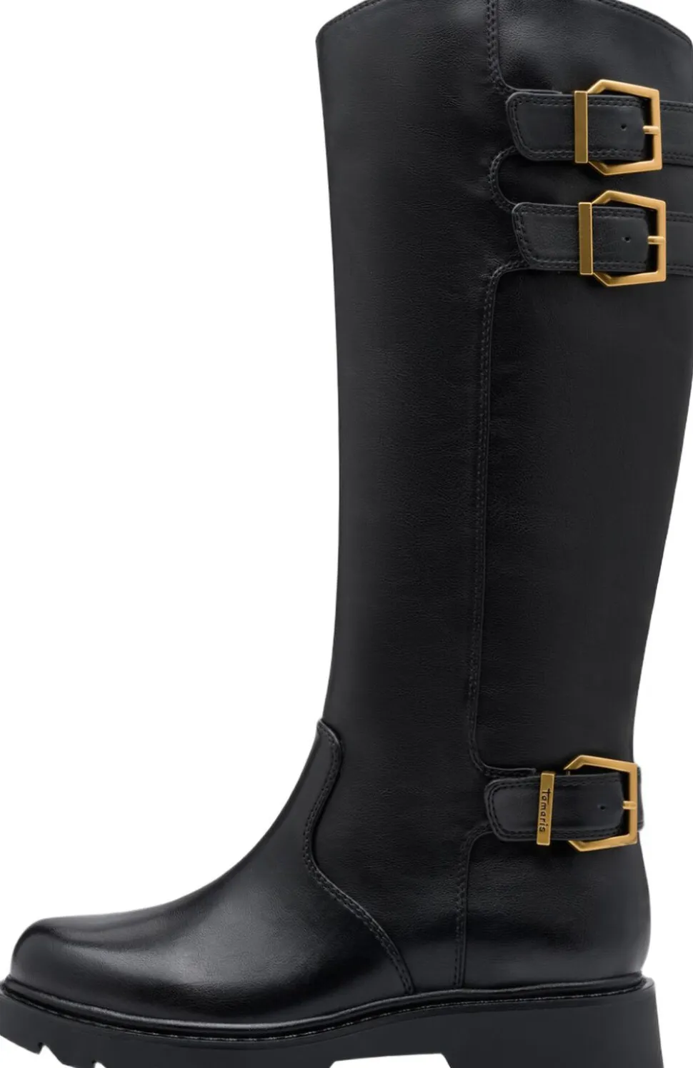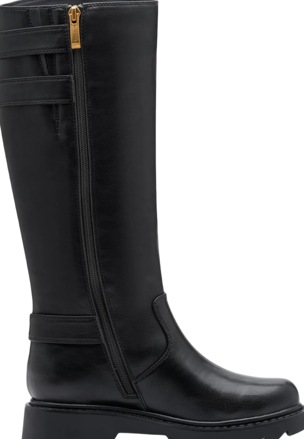 Langskaftet støvle med guldspænder og rem effekter. Sålen er let profil sål. Skafthøjden39,5 cm og hælhøjden 45 mm. Indvendig lynlås