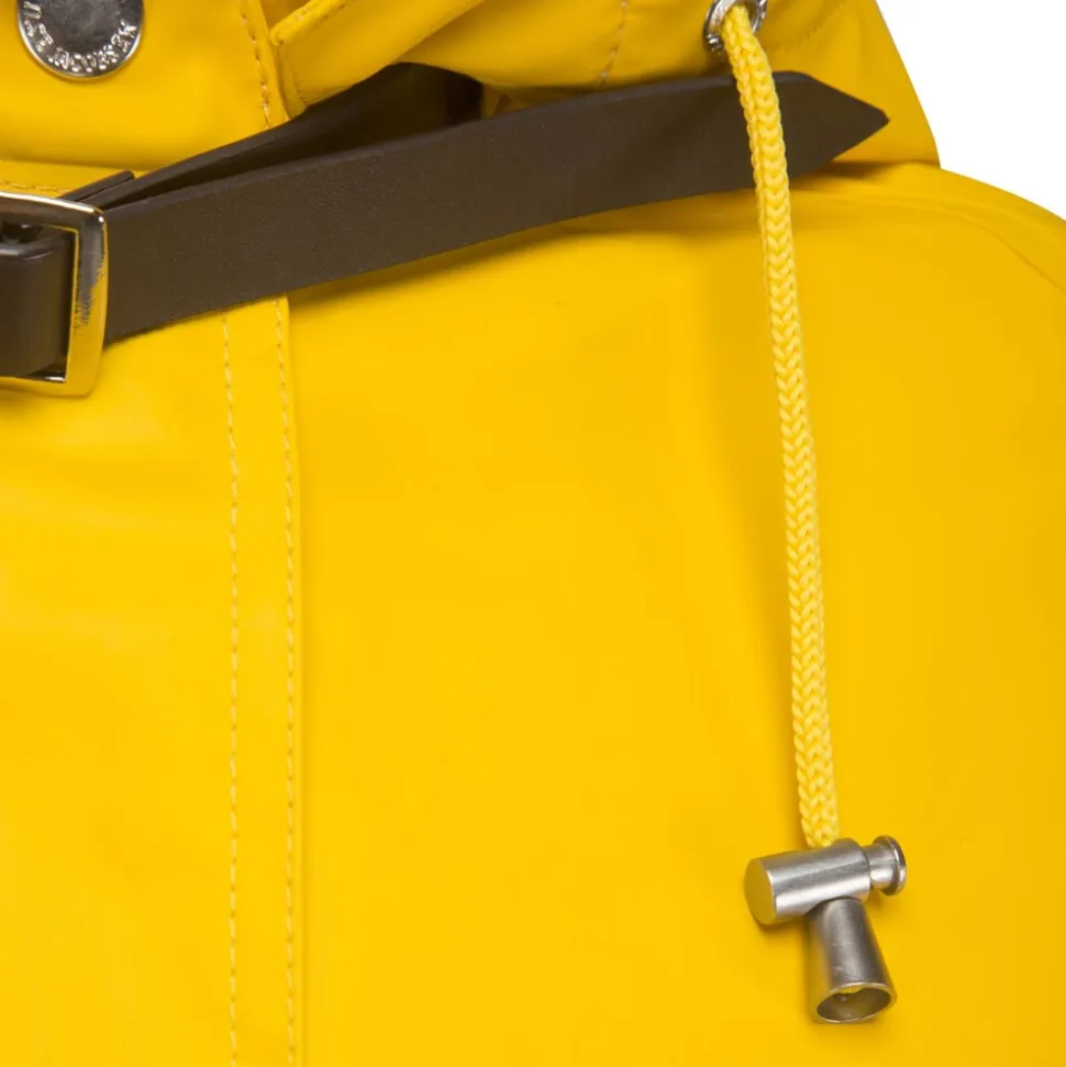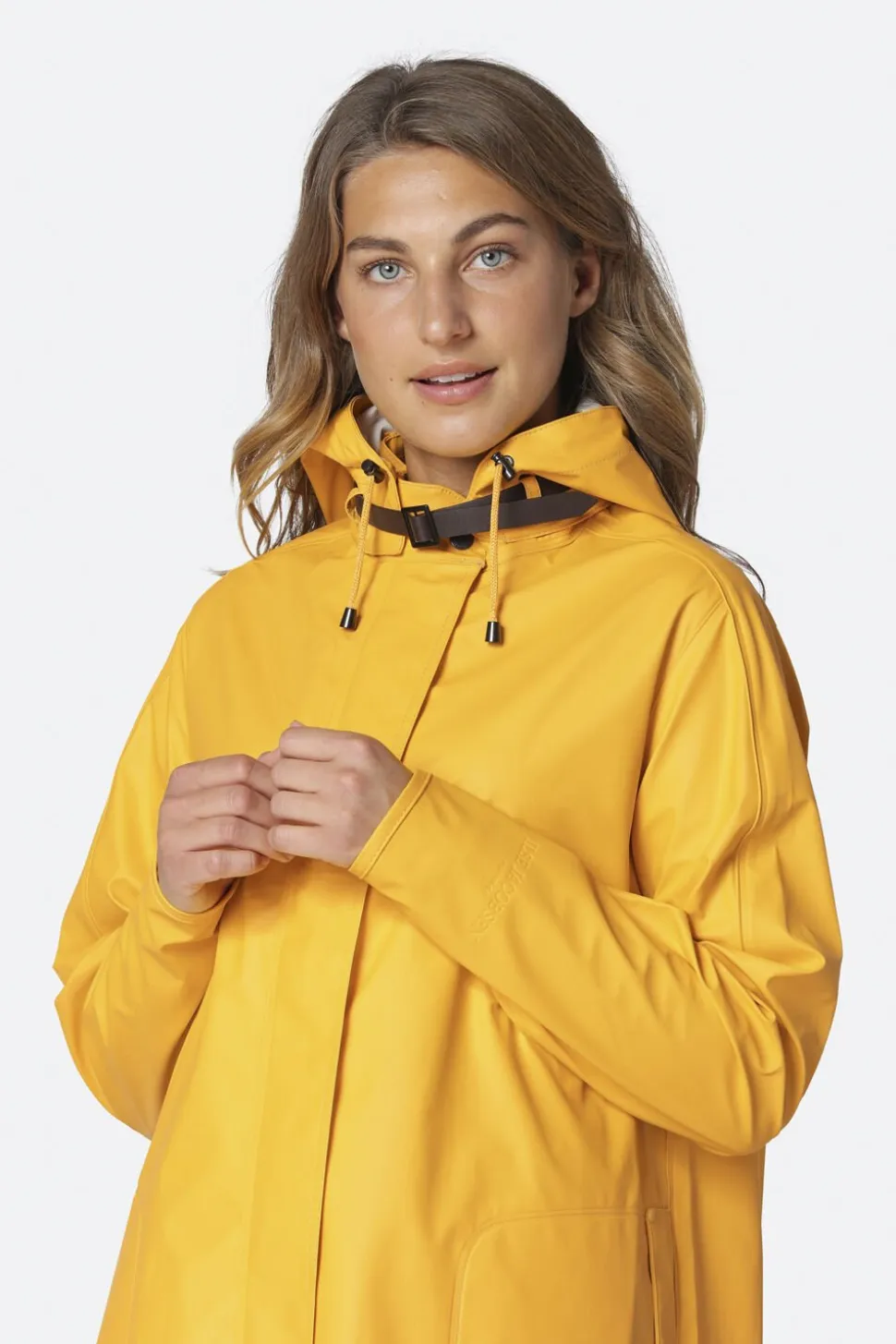 En feminin A-formet regnfrakke med Løs pasform under knæet. Regnfrakken har et diskret Ilse Jacobsen Hornbæk-logo præget på venstre ærme. Hætten er aftagelig og fastgjort med en vejrbestandig strop i kunstlæder. Stilen har sidelommer med flapper, smarte slidser i sidesømmene med trykknapper, knaplukning ved håndleddet og en 2-vejs YKK-lynlås midt foran. Indvendigt har stilen en ren og fin finish med et logobånd. Kvaliteten er en let og subtil vandtæt gummibelagt PU med polyester tricot på bagsiden, og alle sømme er dobbeltsvejsede. Stilen fås i et bredt udvalg af både klassiske og sæsonbestemte farver. Sammensætning: 100 % polyester trikot med PU-belægning. Funktionalitet: B/P 5000 mm