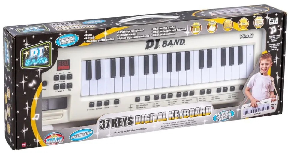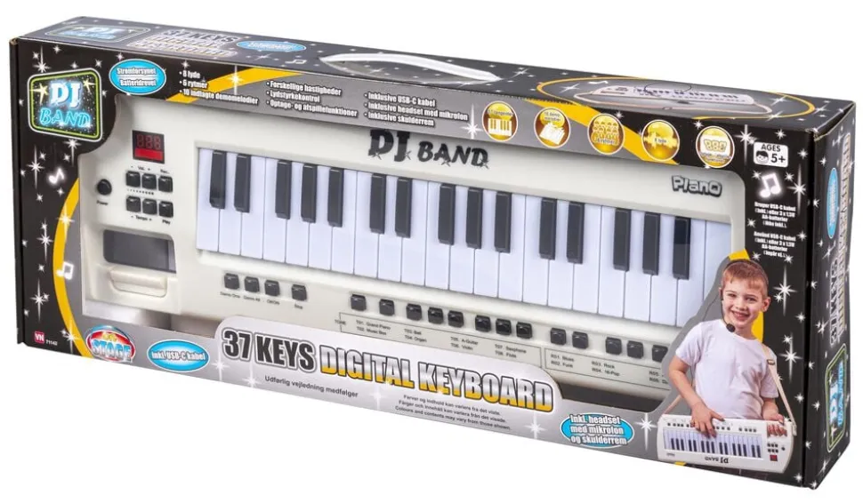 37 tangenters keyboard med headset og skulderrem. Med 8 lyde, 6 rytmer, 10 demomelodier, forskellige hastigheder, volumenkontrol, optage- og afspille-funktioner. Inkl. headset med mikrofon og skulderrem. Inkl. USB-C kabel. Kan også bruges med 3 stk. AA-batterier (ikke inkl.).