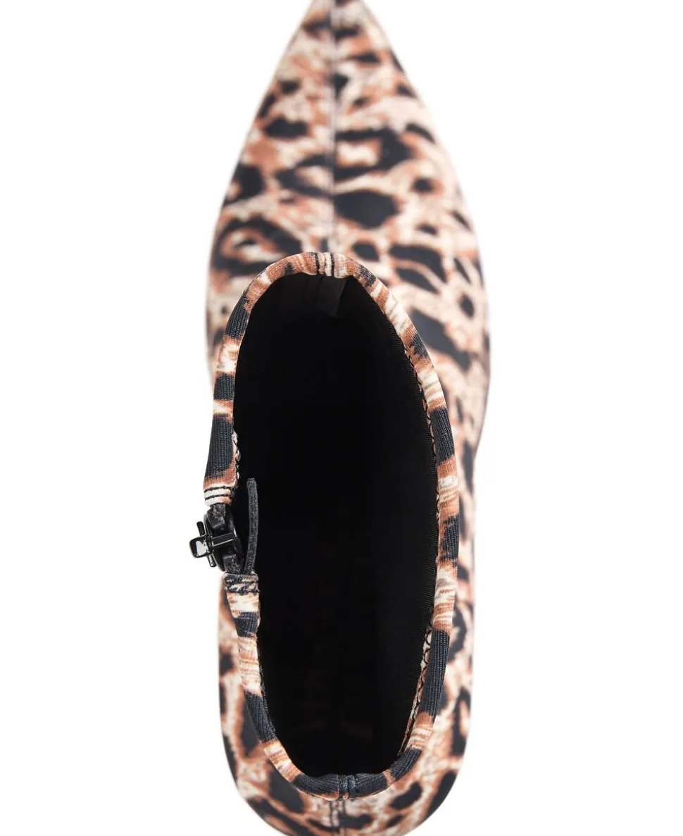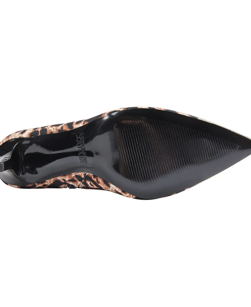 Støvle fra Versace Jeans Couture i en smuk kvalitet med et leopardprintet mønster. Støvlen er enkel i modellen med en slank pasform, lynlåslukning på indersiden, en hæl på 8,5cm samt den flotteste, metalliske detalje omkring støvlens spidse snude. Dustbag medfølger.