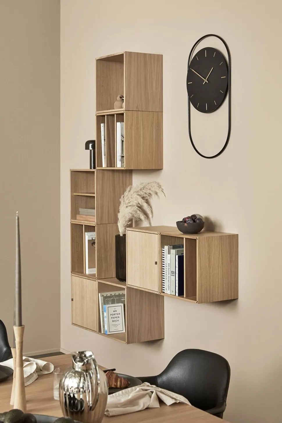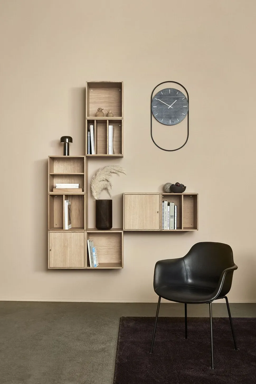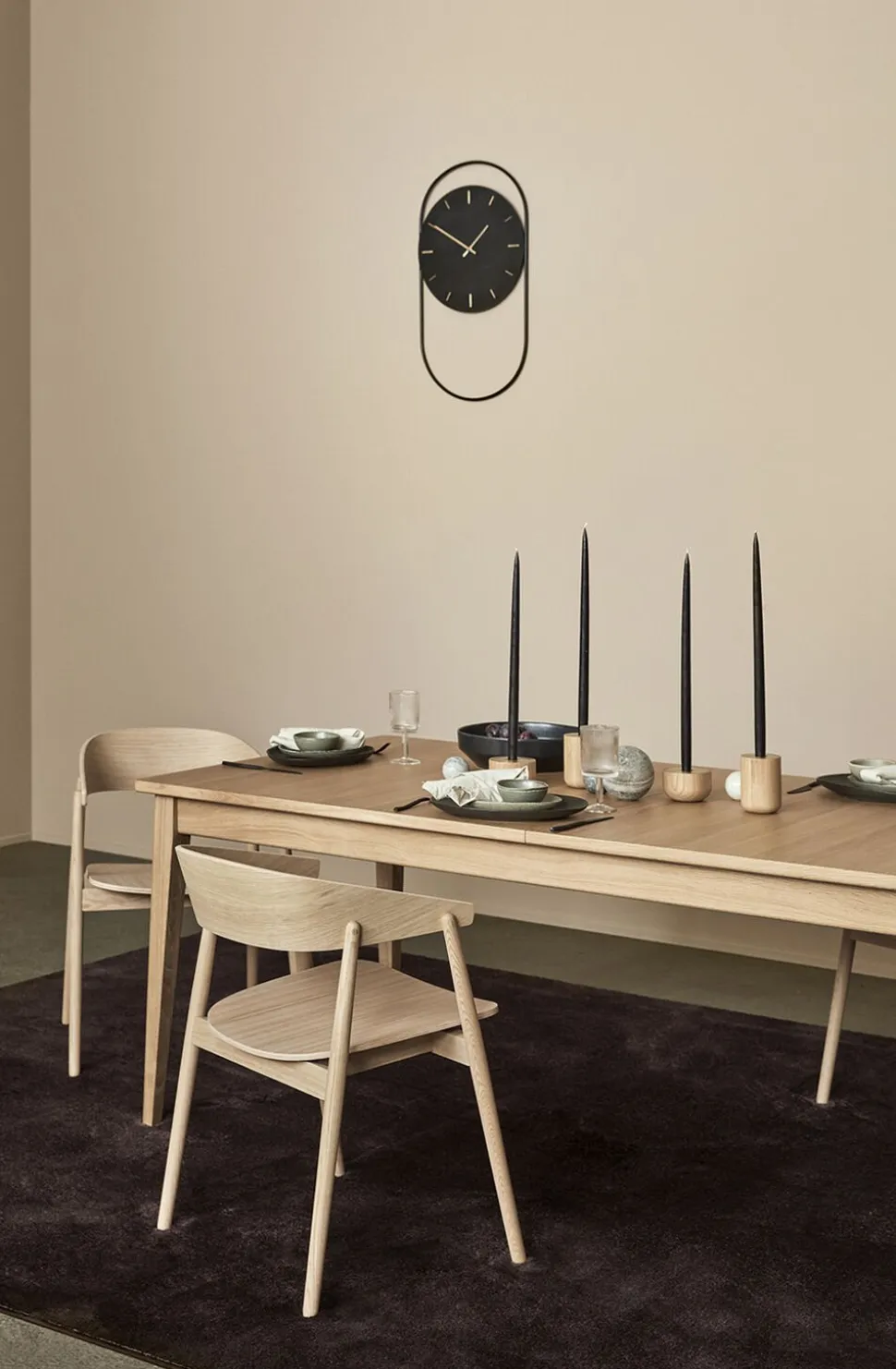 A-Wall Clock er et smukt vægur med et enkelt og grafisk udtryk. Uret fås i to udgaver – den ene med urskrive i sort malet træ og sort metal ring, den anden har urskrive i eg og elegant ring i messing.