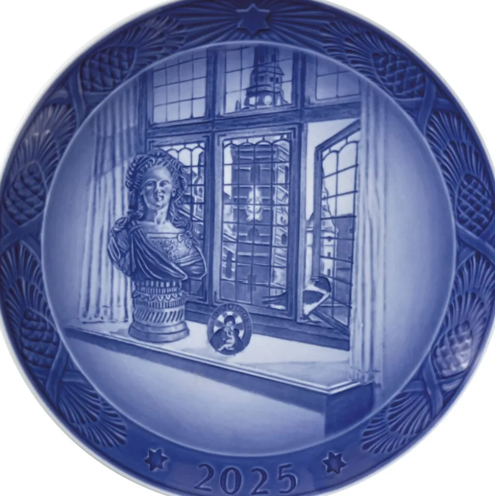 Royal Copenhagens årsplatte 2025 markerer Royal Copenhagens 250-års jubilæum og illustrerer en buste af dronning Juliane Marie, der var en af grundlæggerne af porcelænsfabrikken i 1775. Ved siden af hende på vindueskarmen står den allerførste årlige platte fra Royal Copenhagen fra 1908, og gennem vinduet kan man se Frederiksborg Slot.