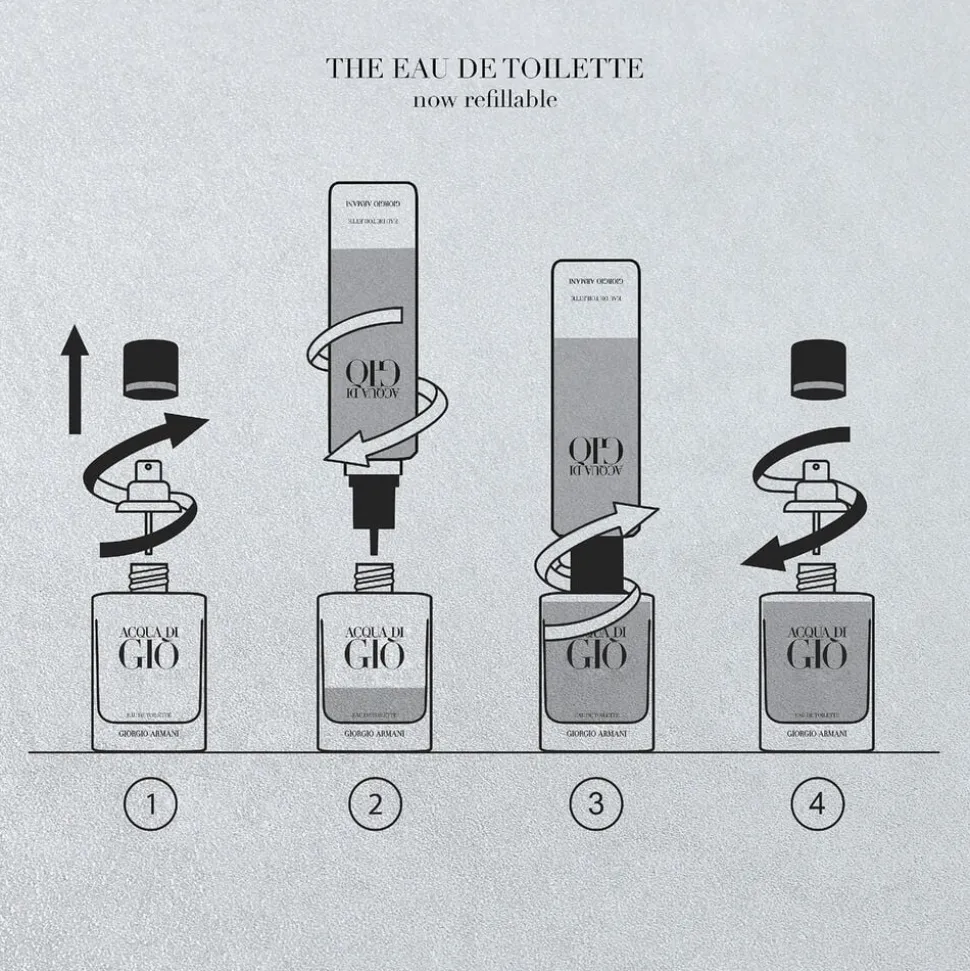 Alle størrelser af ACQUA DI GIÒ EAU DE TOILETTE kan genopfyldes. Refill-flasken sælges separat.