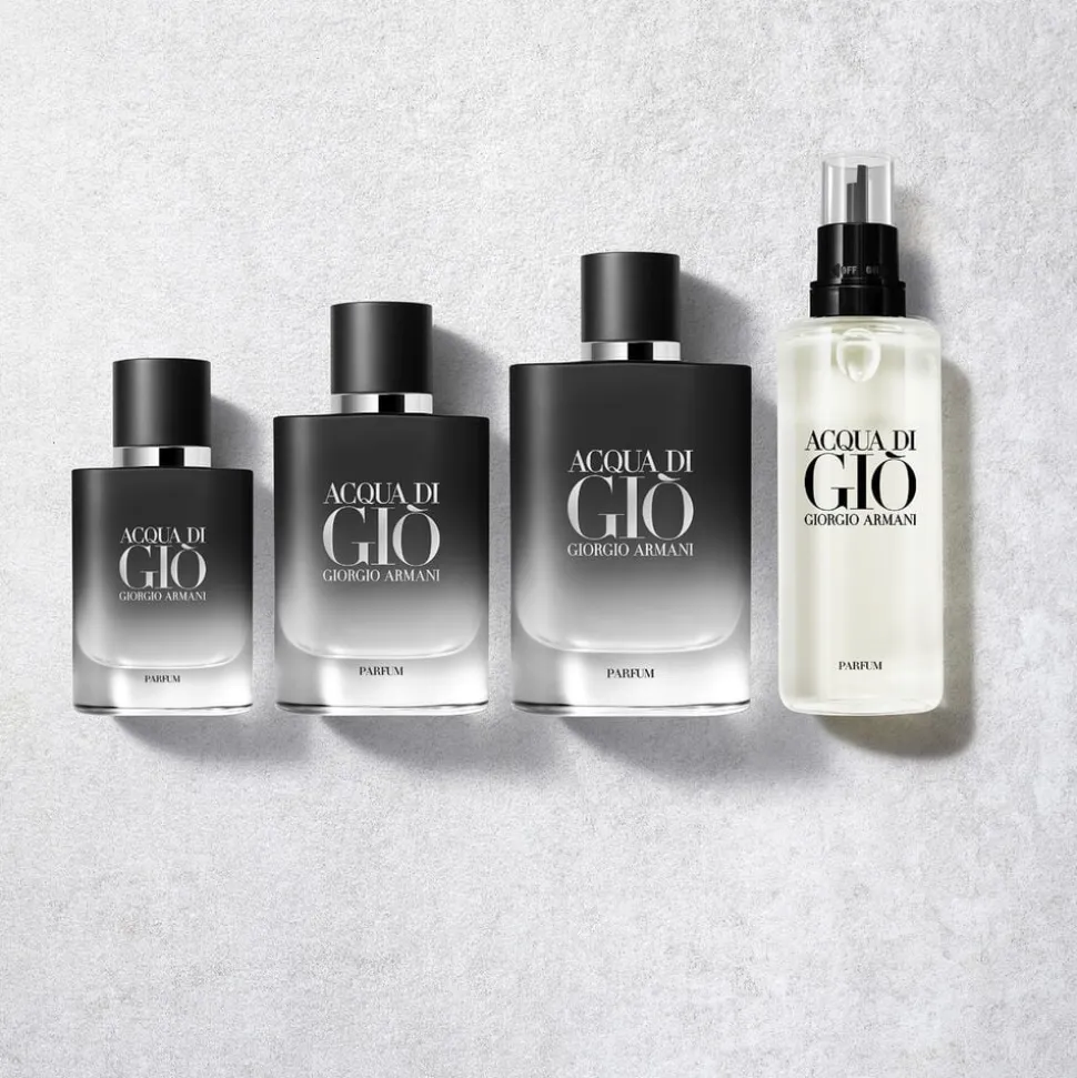 Alle størrelser af Acqua di Giò Parfum kan genopfyldes med denne refill, hvilket understreger brandets forpligtelse over for miljøet.