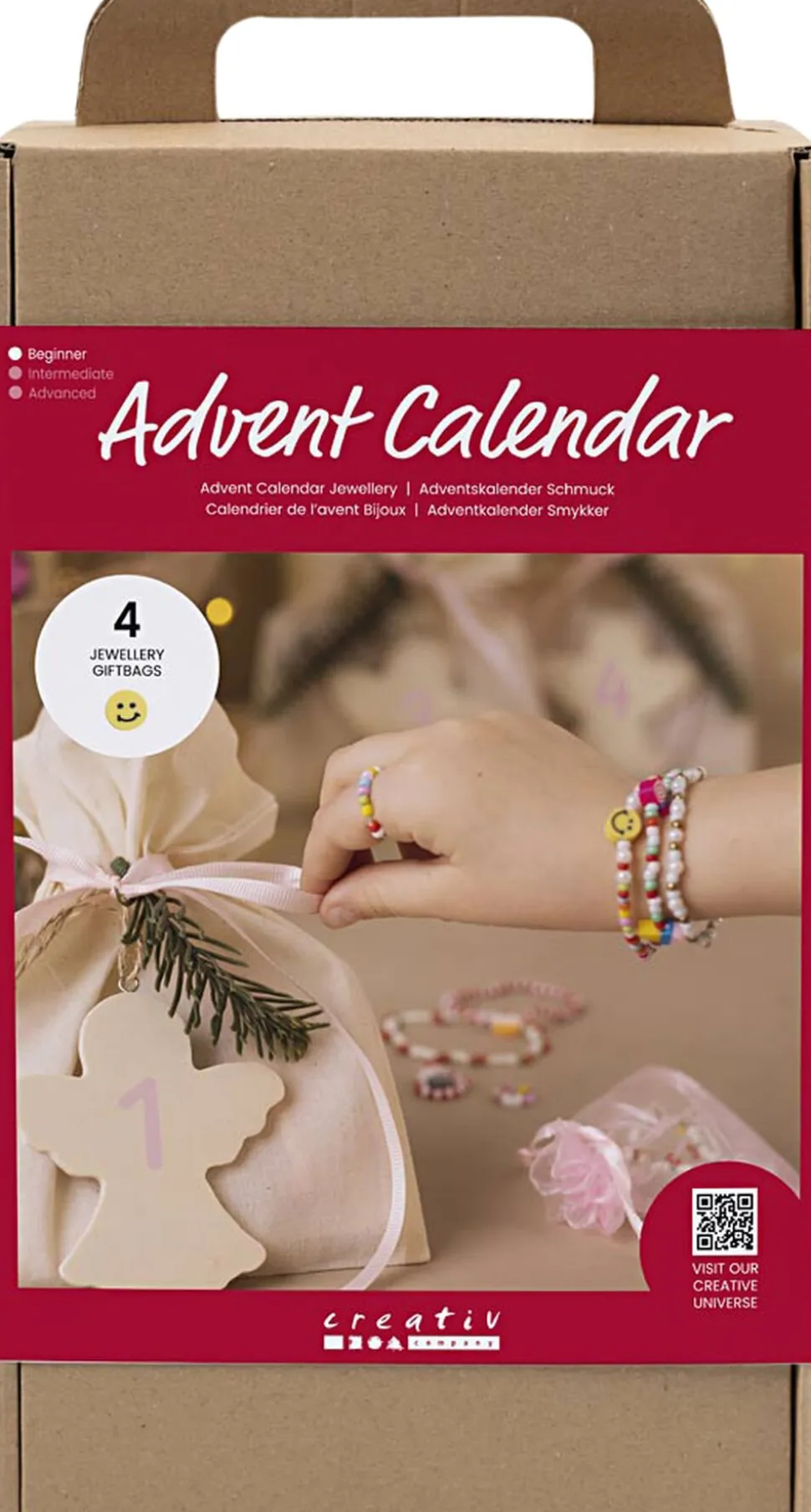 Årets adventskalender til smykkeentusiasten. Glæd dig til hver søndag i advent, hvor et nyt smykkeprojekt venter på dig. Indeholder alle de materialer du skal bruge, og al den vejledning du behøver. For børn og voksne er adventskalendere og julekalendere noget af det bedste ved julen. Det skaber en forventningsglæde i december og de fleste elsker glæden ved de små overraskelser, som venter på en. En julekalender er nemlig en påmindelse om, at julen nærmer sig, og en adventskalender er med til at gøre hver søndag i advent ekstra særlig. Er du vild med hjemmelavede perlesmykker, er denne adventskalender perfekt. Kalenderen består af fire gaveposer én til hver søndag i advent og med et nyt smykkeprojekt i hver. Selvom indholdet er en overraskelse, lover vi masser af smykkesjov i december.