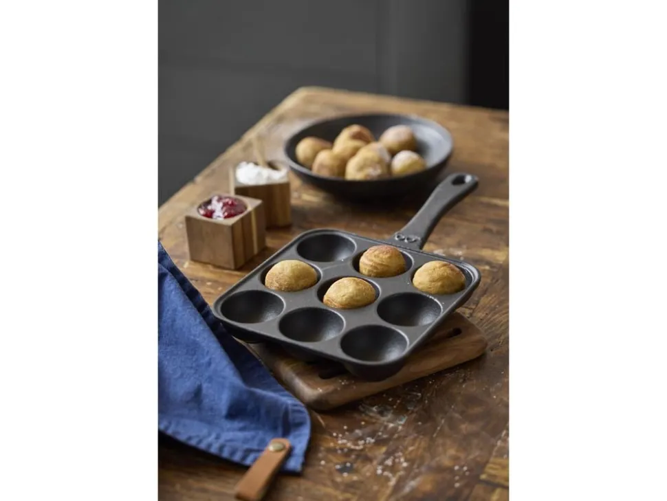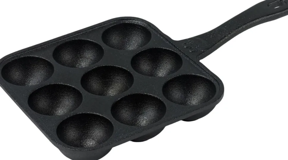 Æbleskivepande m. 9 huller i støbejern. Også god til frække torskedeller, frikadeller, muffins, lasagne on kop & falafel kun fantasien sætter grænser. 33 x 19 x 4,5 cm.