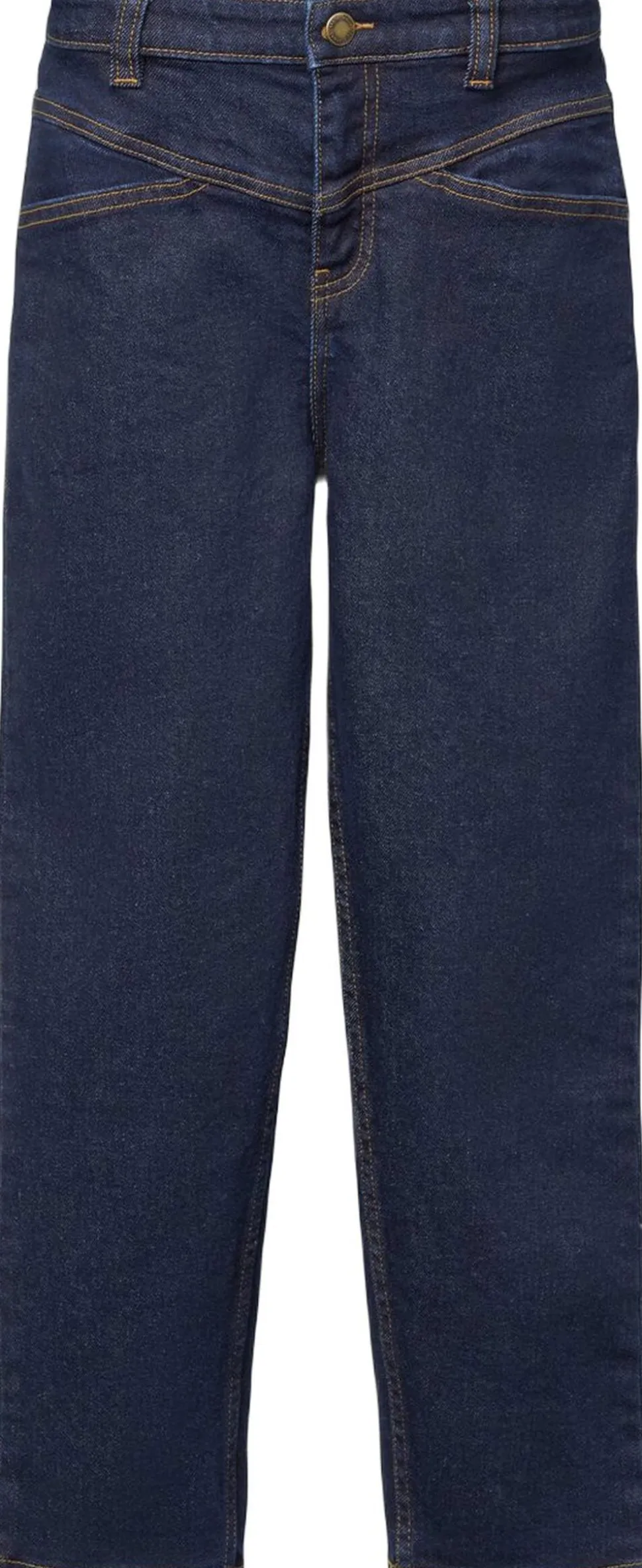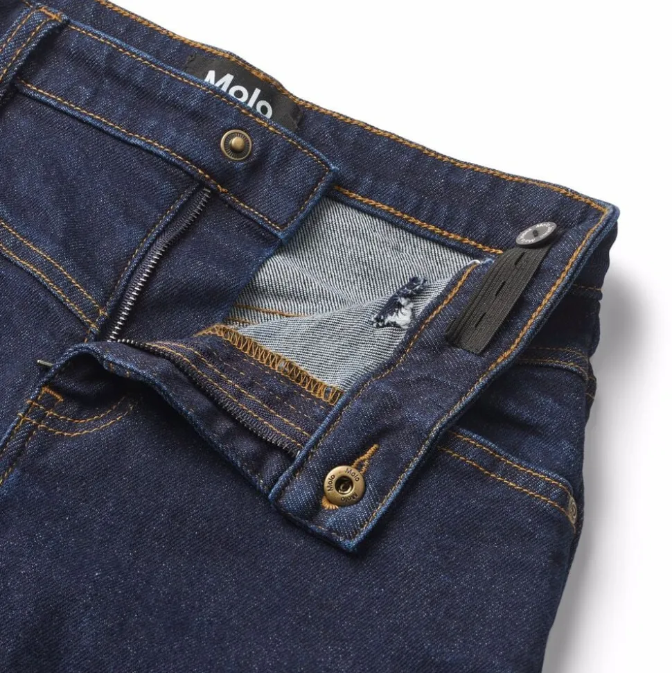 Disse mørkeblå denimjeans fra Molo er lavet af økologisk bomuld med kobberfarvede stikninger. Jeansene har en normal pasform, stikninger foran og to forlommer. Livvidden kan justeres med en indvendig elastik for optimal pasform til alle børn. Størrelser 92-134 har trykknap, mens størrelser 140-176 har en almindelig jeansknap.