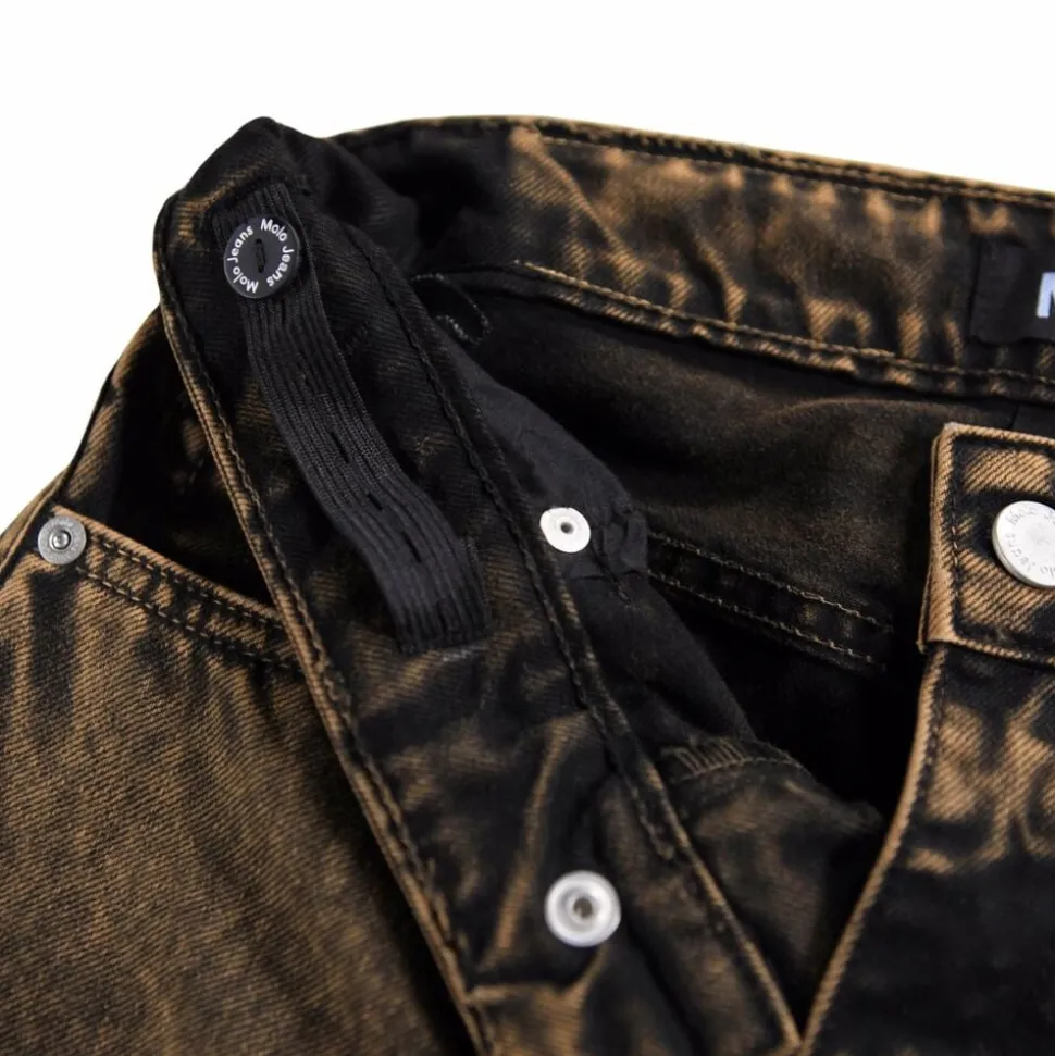 Disse denimjeans fra Molo er lavet i økologisk bomuld med en sort og rød vask. Bukserne har 5 lommer og en bred pasform, inspireret af skatermiljøet. Livvidden kan justeres med en indvendig elastik for optimal pasform til alle børn. Størrelser 92-134 har trykknap, mens størrelser 140-176 har en almindelig jeansknap.
