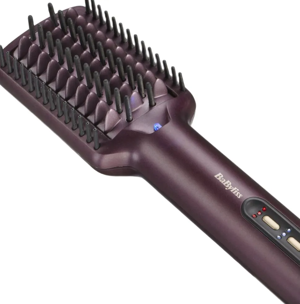Keramisk udglatningsplade med udglattende piggeog præcist placerede silikonebørster for at giveperfekt spænding til alle hårtyper
