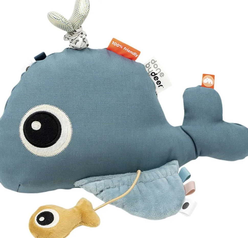 De små underholdes af deres eget spejlbillede, hvilket gør Wally-gulvspejlet ideelt når baby skal øve sig i at ligge på maven. De mange sensoriske funktioner og detaljer vil bidrage til længere og mere aktiv tid på maven for de små. Spejlet, farverige mærker, taktile detaljer, knitre- og klokkelyde stimulerer de små sanser. Lad de små trække i vanddråberne på Wallys hoved og mærk hvordan hele hvalen vibrerer eller opdag hvordan Wallys fiskeven gemmer sig under hvalens finne. Wallys mange funktioner understøtter dit barns udvikling fra aktivitet på mave til siddende leg. Den søde hval står stabilt på gulvet da bunden er fyldt med sand og den kan let flyttes. Den blå hval og sandfarvede fisk er klar til masser af leg.