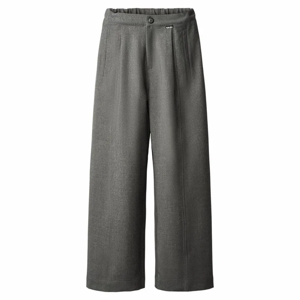 Disse grå flannelbukser fra Molo har en løs pasform, er let højtaljede med brede ben og læg, hvilket skaber en flot silhuet. De har to sidelommer og en flot syning ned langs benene foran og bagpå. Taljen har knap- og lynlåslukning samt en indvendig justerbar elastik for en god pasform.