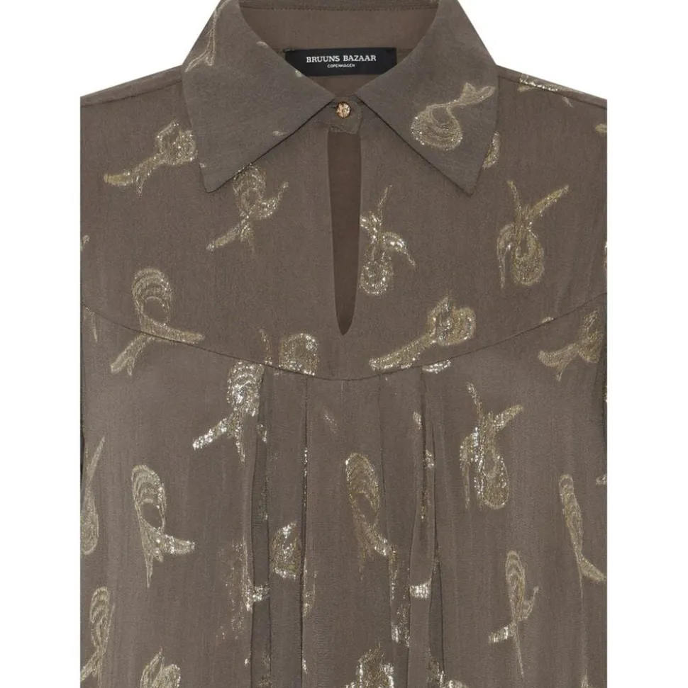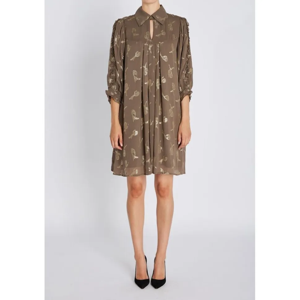 AmaranthusBBTammi-kjolen er en Løs kjole i knælængde med krave og pufærmer. Den transparente overflade og det gyldne tryk giver den et legende og elegant look. Sæt den sammen med støvler og tights til efteråret, eller style den med hæle og en håndtaske til en festlig aften. – Løs pasform – Knælængde, 95cm i størrelse 36 – Puffærmer med elastiske manchetter – Krave med nøglehulsåbning