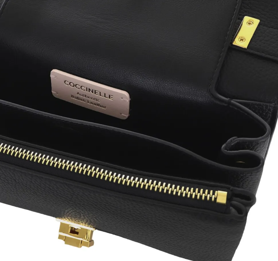 Lækker taske fra Coccinelles icon serie Arlettis. Denne version er i blødt, lækkert skind. Tasken lukkes med en flap og har den karakteristiske Arlettis lås. Tasken kan bæres som håndtaske såvel som skuldertaske og har 4 indvendige rum med henholdsvis lynlås og flaplukning. Remmen er justerbar.