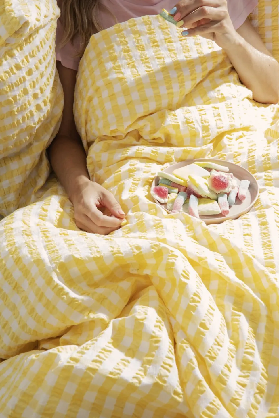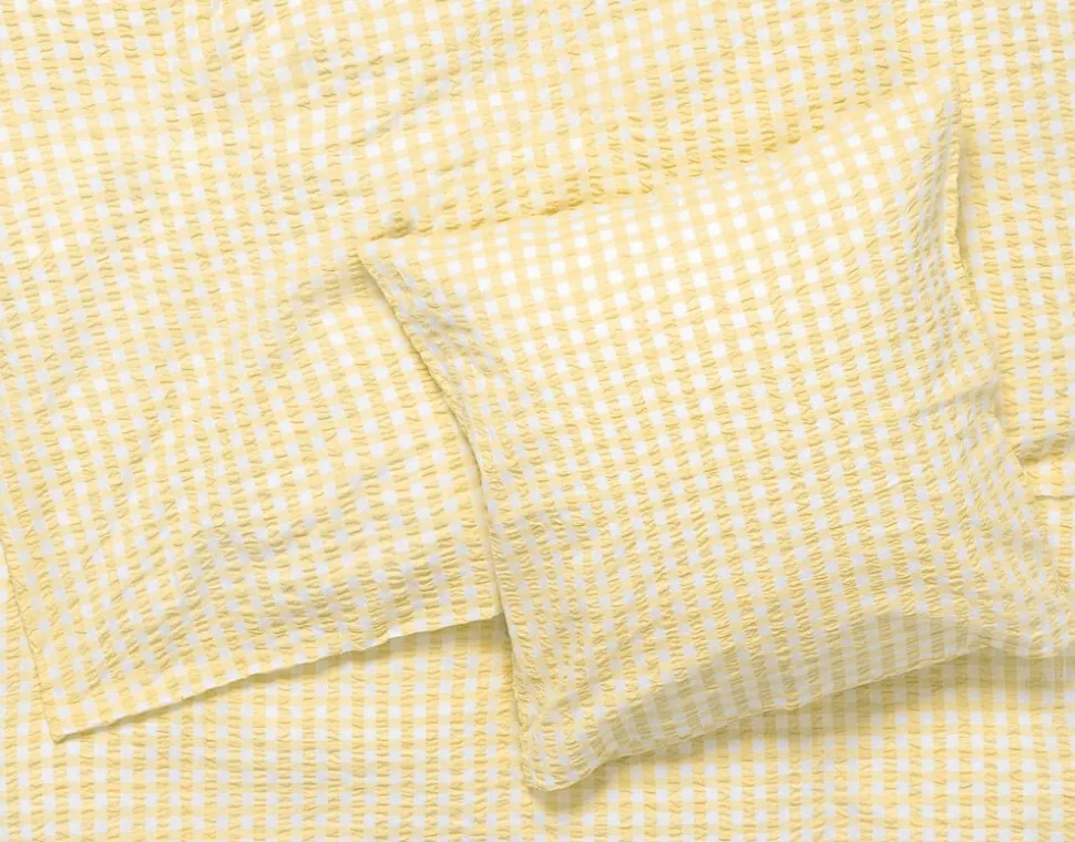 Sov godt! Bæk & Bølge er for mange lig med en god nats søvn i det blødeste bløde sengetøj hjemme hos mormor eller farmor. Og netop genkendelsens glæde er inspirationen til vores populære Bæk & Bølge-serie i 100% økologisk bomuld. Dynebetrækket lukkes med knapper, mens pudebetrækkene har kuvertlukning. Sengetøjet i den skønne farvekombination gul/hvid er OEKO-TEX®-mærket og kan vaskes ved 60°. Fås også i farvekombinationerne lys blå/hvid, hvid/hvid, pink/hvid, grøn/hvid og mørk blå/hvid. Fås også til 140×220 cm enkeltdyne og til dobbeltdyne.